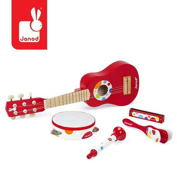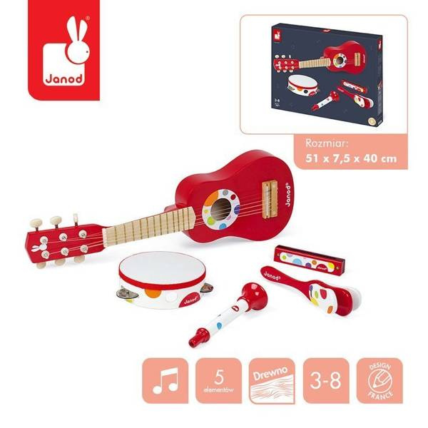 Duży zestaw drewnianych zabawek muzycznych francuskiej marki Janod rozbudzi w Twoim dziecku wyobraźnię i zachęci do wspólnych zabaw. Każda zabawka brzmi inaczej, dzięki czemu Twoje dziecko będzie miało możliwość poznania wielu dźwięków i stworzenia z przyjaciółmi własnego zespołu. W skład zestawu wchodzą: gitara z możliwością nastrojenia, tamburyn, harmonijka, trąbka oraz kastaniety.