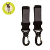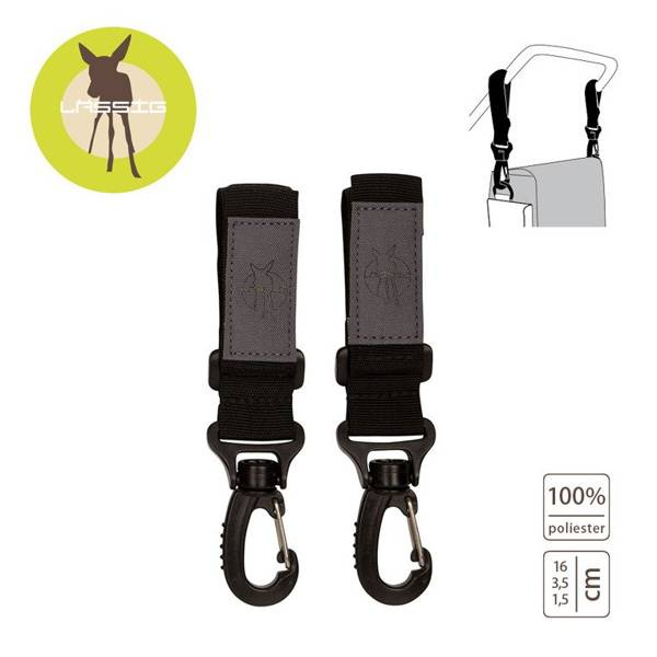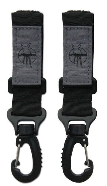 2 solidne regulowane uchwyty z rzepami do mocowania torby lub innych dodatków na ramie wózka. Rozmiar uniwersalny – pasuje do każdego modelu. Kolor czarny z ciemnoszarą, materiałową naszywką z logo marki.