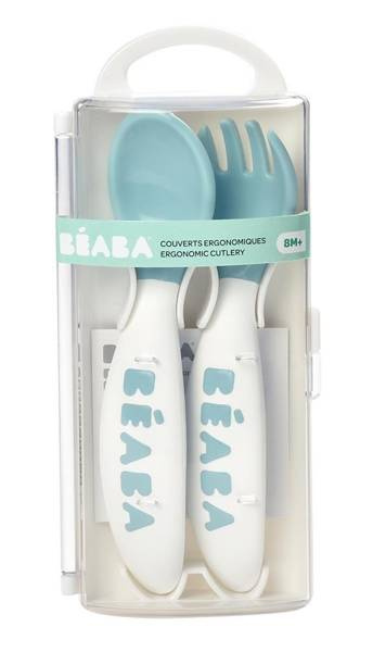 Komplet sztućców francuskiej marki BEABA. Na zestaw składa się łyżeczka i widelczyk – białe z ciemnoniebieskimi główkami i logo. Są wyprofilowane tak, by były łatwe do uchwycenia nawet przez małe dzieci. Odpowiednie dla lewo- i praworęcznych maluchów. Ich zaokrąglony kształt oraz miękkość sprawiają, że nie ma ryzyka uszkodzenia delikatnych dziąseł. Sztućce znajdują się w przezroczystym plastikowym etui. Można je w nim wygodnie przechowywać czy zabierać w podróż i na spacer.