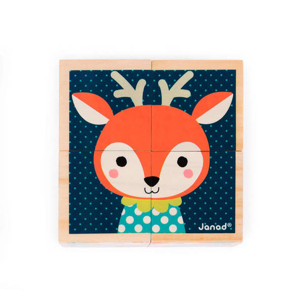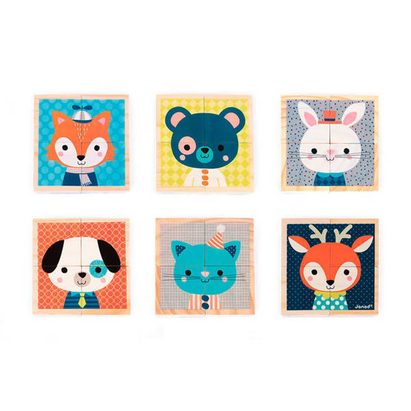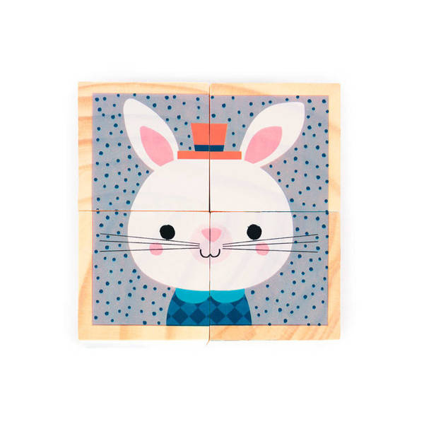 Zestaw składa się z 4 drewnianych klocków. Komplet umożliwia ułożenie 6 różnych obrazków z postaciami zwierząt, mieszkających w lesie i nie tylko: psa, kota, lisa, misia, zająca i jelonka. To doskonała układanka dla małych dzieci na rozpoczęcie przygody z puzzlami. Klocki zaprojektowano we Francji.