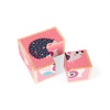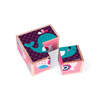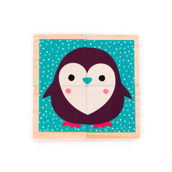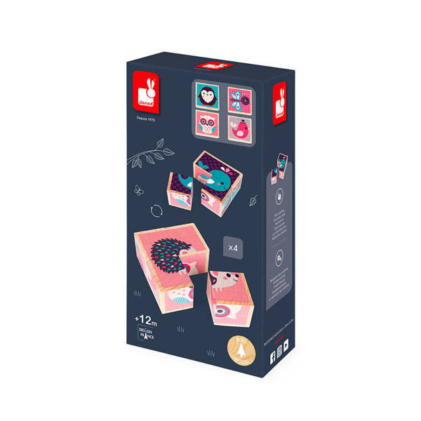 Zestaw składa się z 4 drewnianych klocków. Komplet umożliwia ułożenie 6 różnych obrazków z postaciami zwierząt: jeża, pingwina, wieloryba, sowy, ptaka i ważki. To doskonała układanka dla małych dzieci na rozpoczęcie przygody z puzzlami. Klocki zaprojektowano we Francji.