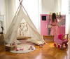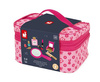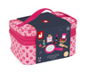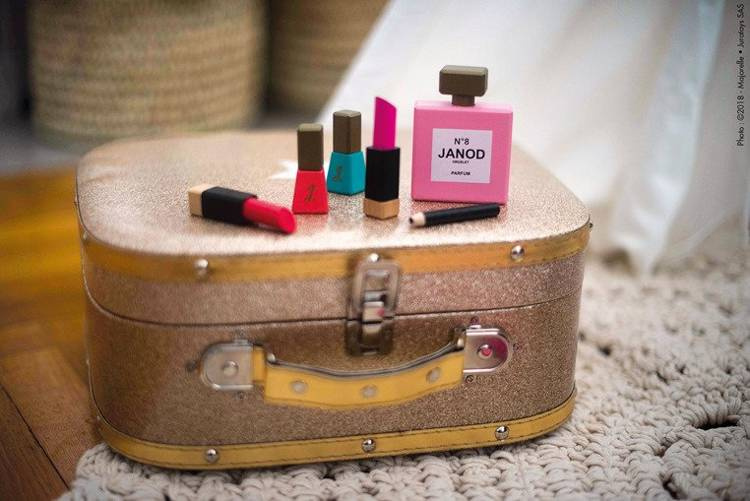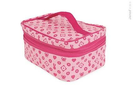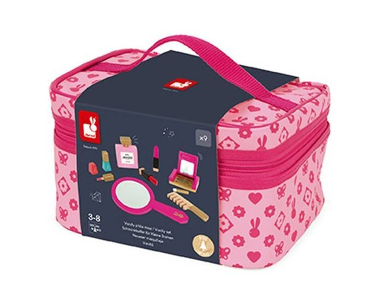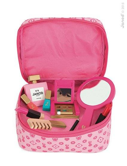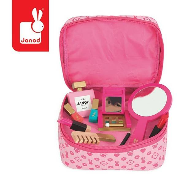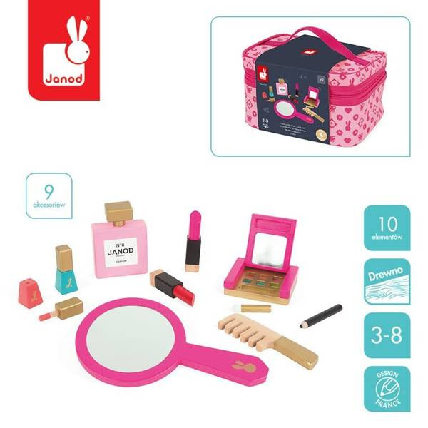 Kosmetyczka z akcesoriami do makijażu francuskiej marki JANOD to doskonała zabawka dla małej księżniczki. W skład zestawu wchodzi: 1 duże okrągłe lusterko z rączką, 1 paleta do makijażu z cieniami w 6 kolorach i pędzelkiem/gąbeczką do ich nakładania; paleta jest zamykana na klapkę, a po jej wewnętrznej stronie znajduje się kolejne małe lusterko, 2 szminki (czerwona i różowa), 2 lakiery paznokci (różowy i niebieski) z wyciąganymi pędzelkami, 1 eyeliner, 1 butelka perfum, 1 grzebień. Wszystkie elementy wykonane zostały z drewna i pomalowane bezpiecznymi dla dzieci farbami. Są precyzyjne i bardzo estetyczne, a zabawa nimi to sama przyjemność, zwłaszcza dla dziewczynek, które lubią naśladować swoje mamy – pomaga im oswajać się z codziennością i przyswajać zasady społecznych zachowań. Prostokątna kosmetyczka na akcesoria jest zapinana na suwak, a wykonana z bawełny w kolorze różowym we wzory. Ma solidną rączkę do przenoszenia i wygląda elegancko. Idealnie nadaje się na prezent.
