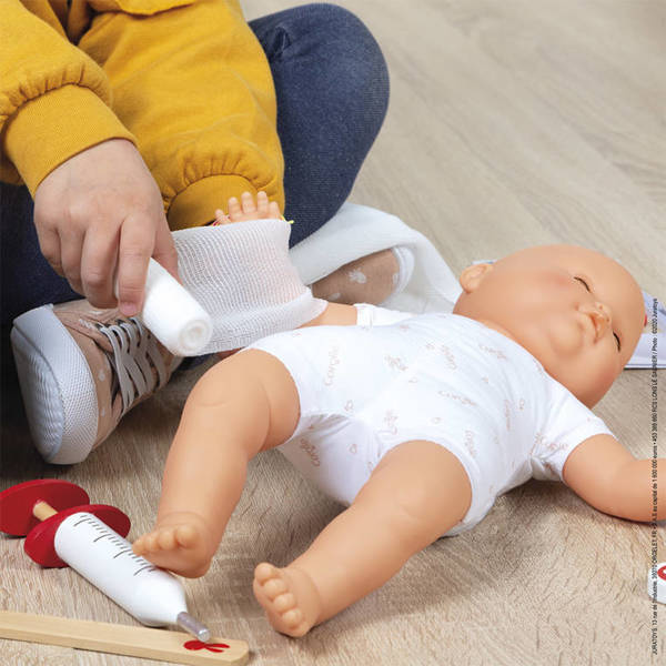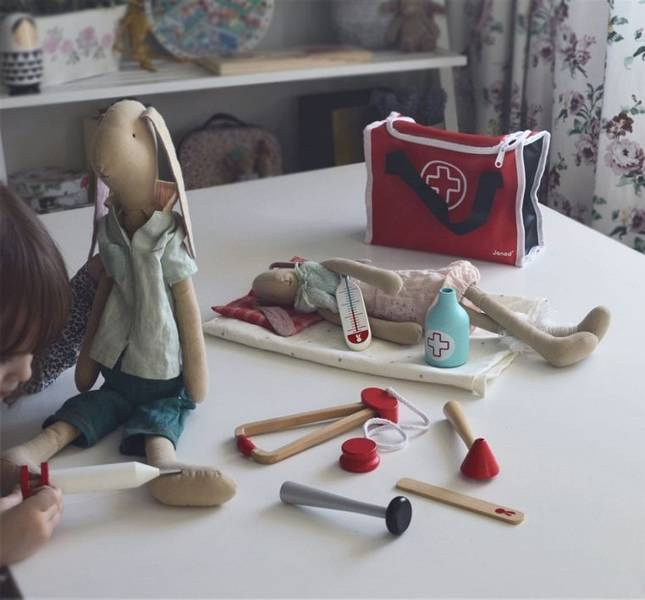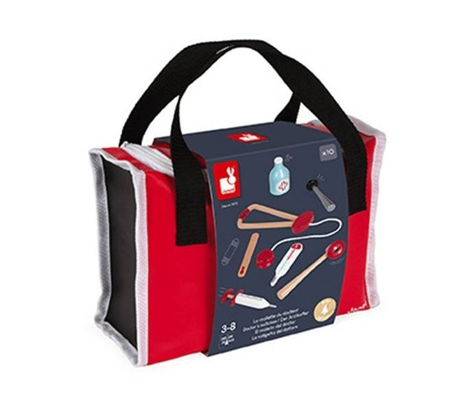 Większość elementów wykonana została z drewna i pomalowana bezpiecznymi dla dzieci farbami. Akcesoria są precyzyjne i bardzo estetyczne, a zabawa nimi to sama przyjemność, zwłaszcza dla dzieci, które lubią naśladować dorosłych – takie zabawy pomagają im oswajać się z codziennością i przyswajać zasady społecznych zachowań. Prostokątna torba lekarska jest zapinana na suwak i wykonana z materiału w kolorze czerwonym (boki czarne) z charakterystycznym znakiem krzyża. Ma solidne czarne rączki do przenoszenia i wygląda bardzo elegancko. Idealnie nadaje się na prezent.