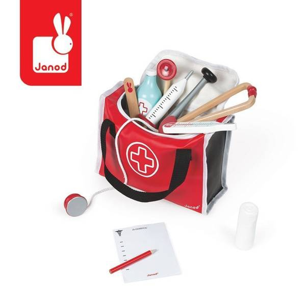 Zestaw lekarza z akcesoriami francuskiej marki JANOD to idealna zabawka dla dzieci lubiących odtwarzać codziennie sytuacje, takie jak wizyta w przychodni. W torbie lekarskiej znajdziemy: