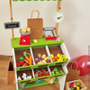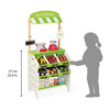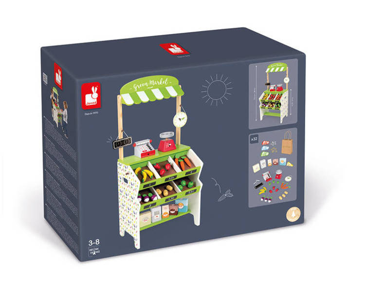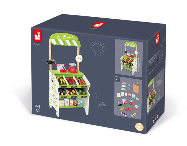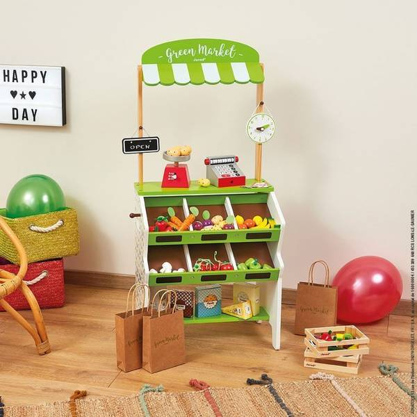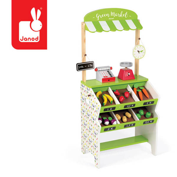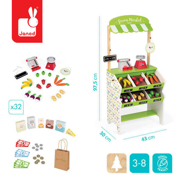 Drewniany, w pełni wyposażony sklep-warzywniak francuskiej marki JANOD to idealny prezent dla każdego dziecka, które lubi bawić się w zakupy i gotowanie. Zabawka wspomaga rozwój dziecka na wielu płaszczyznach: ćwiczy zdolności manualne, uczy cierpliwości oraz koncentracji, rozwija wyobraźnię i umiejętności społeczne. Ponadto dzięki miejscom na segregowane produktów maluch przyswaja sobie również umiejętność porządkowania rzeczy. W skład zestawu wchodzą: