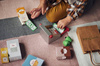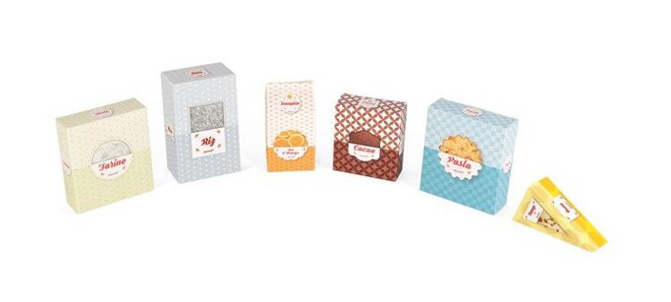 - 6 pudełek imitujących produkty pożywcze– ser, ryż, suszone pomarańcze, kakao, makaron;