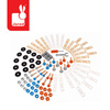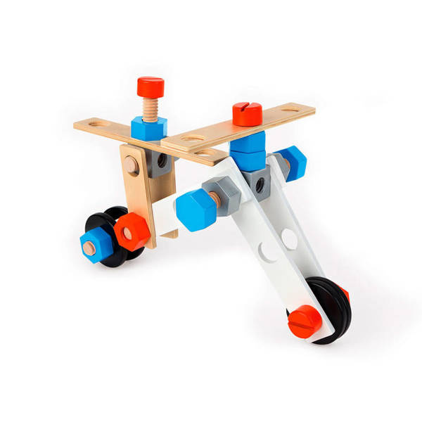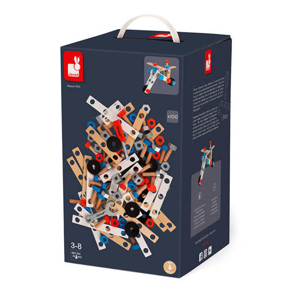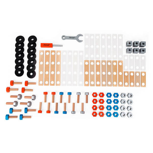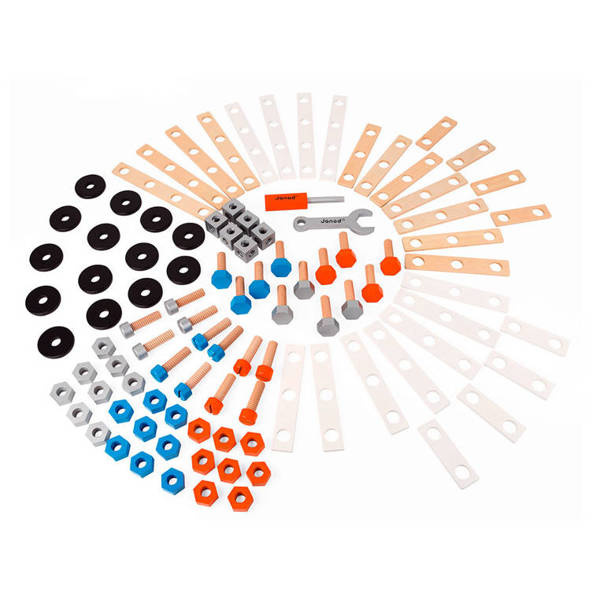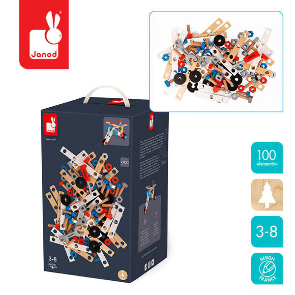 100-elementowy zestaw konstruktora francuskiej marki JANOD to idealny prezent dla małego majsterkowicza. Dzięki różnorodnym drewnianym elementom zabawka wspomaga rozwój dziecka na wielu płaszczyznach: rozwija zdolności manualne, cierpliwość, koncentrację, a także stymuluje wyobraźnię i umiejętności społeczne, zachęcając do odgrywania scen, imitujących zachowanie dorosłych. W skład zestawu wchodzą: wkręty (12 sztuk), śrubki (12 sztuk), kółka (14 sztuk), nakrętki (24 sztuki), różnej długości listwy z otworami do mocowania (30 sztuk), kostki-łączenia (6 sztuk) oraz śrubokręt i klucz. Dołączono do niego również broszurę z propozycjami konstrukcji do zbudowania. Dzięki ogromnej ilości akcesoriów zabawką może bawić się jednocześnie więcej niż jedno dziecko.
