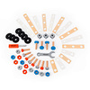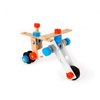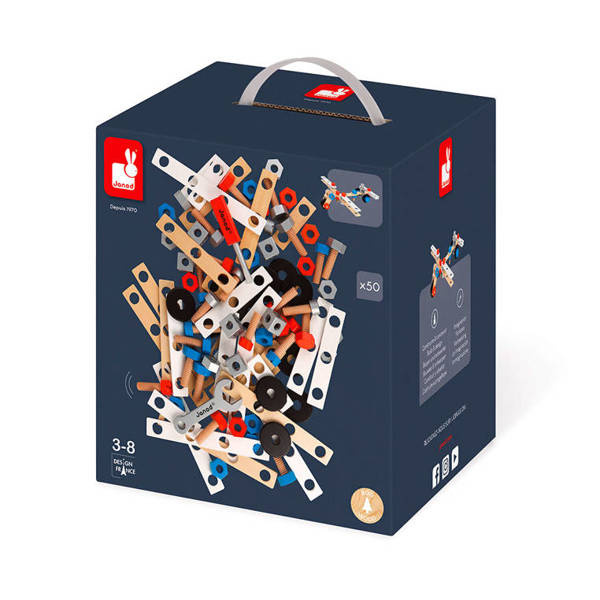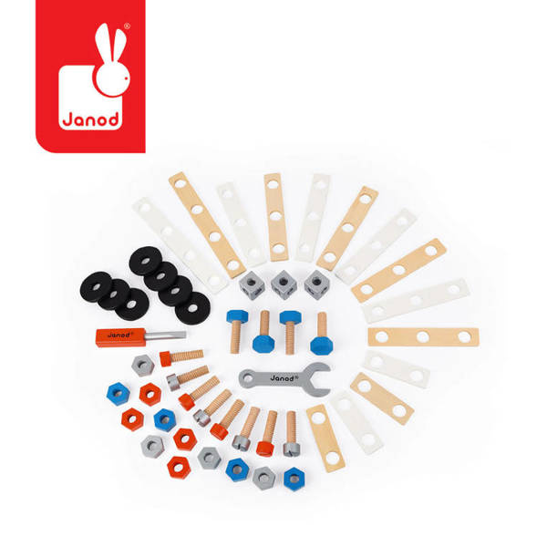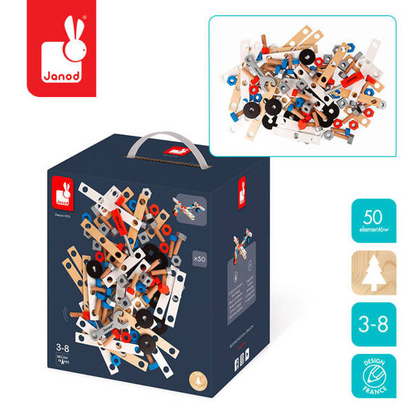 50-elementowy zestaw konstruktora francuskiej marki JANOD to idealny prezent dla małego majsterkowicza. Dzięki różnorodnym drewnianym elementom zabawka wspomaga rozwój dziecka na wielu płaszczyznach: rozwija zdolności manualne, cierpliwość, koncentrację, a także stymuluje wyobraźnię i umiejętności społeczne, zachęcając do odgrywania scen, imitujących zachowanie dorosłych. W skład zestawu wchodzą: wkręty (4 sztuki), śrubki (8 sztuk), kółka (7 sztuk), nakrętki (12 sztuk), różnej długości listwy z otworami do mocowania (14 sztuk), kostki-łączenia (3 sztuki) oraz śrubokręt i klucz. Dzięki sporej ilości akcesoriów zabawką może bawić się jednocześnie więcej niż jedno dziecko.