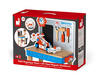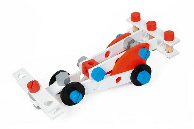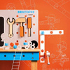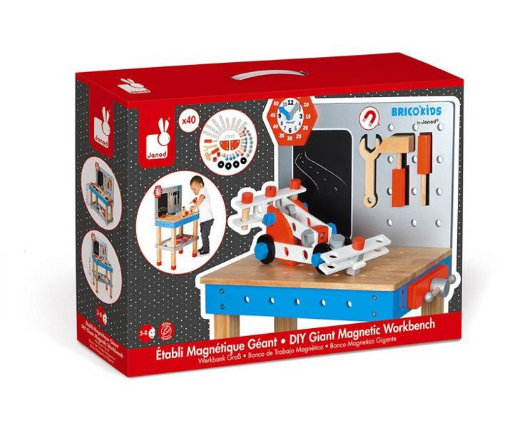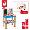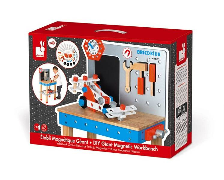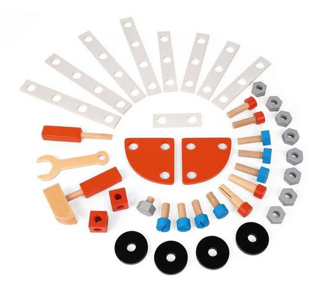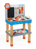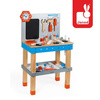 Drewniany, w pełni wyposażony stolik warsztatowy francuskiej marki Janod to idealny prezent dla małego majsterkowicza. Dzięki 40 drewnianym elementom, zabawka wspomaga rozwój dziecka na wielu płaszczyznach: rozwija zdolności manualne, uczy cierpliwości i koncentracji, rozwija wyobraźnię oraz umiejętności społeczne zachęcając do odgrywania scen imitujących zachowanie dorosłych. Dzięki miejscom na posegregowane narzędzia dziecko uczy się również porządku. W skład zestawu wchodzą: śrubki, nakrętki, 3 magnetyczne narzędzia, przyczepiane do ściany warsztatu: śrubokręt, klucz, młotek. Stolik wyposażony jest w imadło, magnetyczną ściankę, półkę do przechowywania, czarną tablicę do pisania kredą oraz zegar do nauki czasu. Dodatkowo, w zestawie znajdziemy instrukcję do zbudowania samochodu wyścigowego ze śrubek i nakrętek. Dzięki znacznym rozmiarom i wielu akcesoriom (54,5x31x83 cm), warsztatem może bawić się jednocześnie więcej niż jedno dziecko, a regulowane nogi pozwalają na zmianę wysokości stołu (maksymalna wysokość 50,7cm).