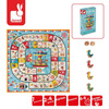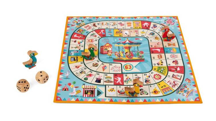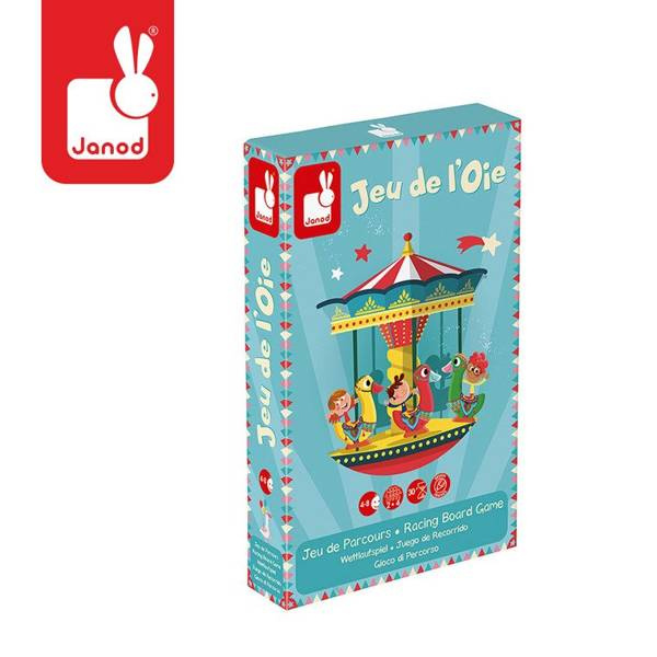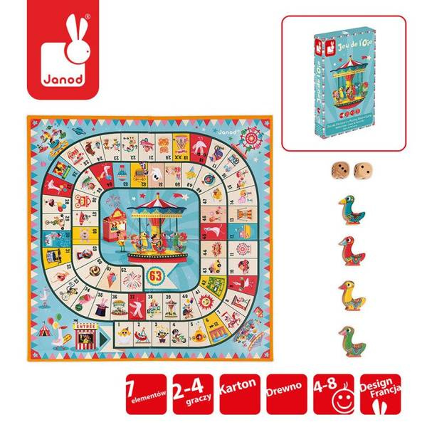 Gra wyścig Gąski francuskiej marki JANOD to wspaniała zabawa dla dwóch do czterech osób – zarówno dzieci, jak i dorosłych. Zestaw zawiera planszę, wykonaną z solidnego kartonu oraz drewniane elementy: 4 pionki-gąski i 2 kostki. Gracze wcielają się w role gęsi, które mają za zadanie dotrzeć do karuzeli w środku planszy, tj. do pola nr 63, pokonując po drodze różne przeszkody i korzystając z atrakcji wesołego miasteczka. Wygrywa gracz, który znajdzie się na miejscu jako pierwszy.