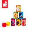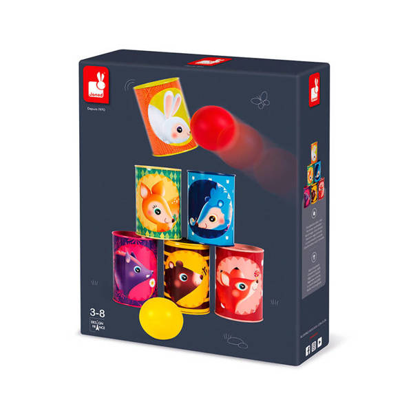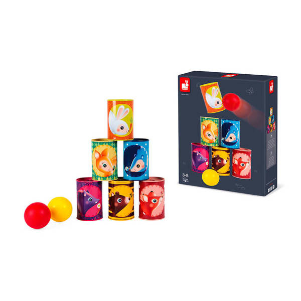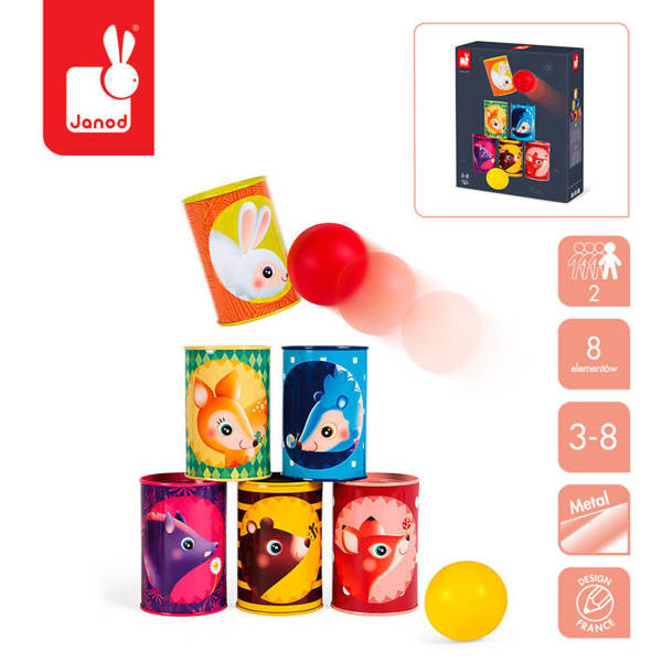 Gra w zbijanie metalowych puszek francuskiej marki JANOD to doskonała zabawa dla całej rodziny. Puszki są pięknie zdobione postaciami leśnych zwierząt (zająca, sarenki, jeża, dzika, liska i niedźwiedzia), układa się je w piramidę (wg schematu trzy-dwa-jeden), a następnie celuje w nie z większej odległości dołączonymi do zestawu piankowymi piłkami. Celem gry jest przewrócenie, tj. zbicie wszystkich puszek. To świetna gra zręcznościowa, idealna do zabaw plenerowych, np. na pikniki czy urodzinowe przyjęcia.