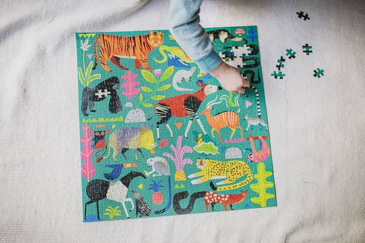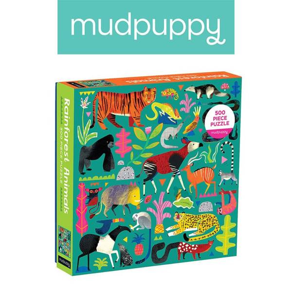 Puzzle rodzinne 500 elementów Zwierzęta z lasu deszczowego amerykańskiej marki MUDPUPPY po ułożeniu tworzą duży obraz o wymiarach 51 x 51 cm. Przedstawiają niezwykłych i barwnych mieszkańców lasu deszczowego, m.in. goryla, antylopę, lemura czy kameleona. Układanie tych wyjątkowych puzzli to doskonała rozrywka dla całej rodziny i świetne źródło wiedzy o mniej znanych gatunkach zwierząt. Autorką ilustracji jest angielska graficzka, podróżniczka i miłośniczka kolorów Natasha Durley. Puzzle zapakowane są w estetyczne pudełko. Idealnie nadają się na prezent.