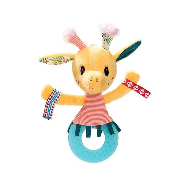 Grzechotka z gryzakiem i szeleszczącą folią Żyrafka Zia belgijskiej marki Lilliputiens to aktywizująca zabawka dla niemowląt. Ma postać słodkiej Żyrafki Zii, która potrząsana wydaje przyjemne dla ucha dźwięki, a jej łapka szeleści przy pocieraniu. Żyrafka ma długie różki, uszka i kolorowe tasiemki na łapkach, które dodatkowo stymulują sensorycznie. Dół zabawki stanowi z kolei niebieski, okrągły, fakturowany gryzaczek, łatwy do utrzymania w małych rączkach. Zabawka rozwija małą motorykę (chwytanie i potrząsanie), aktywizuje zmysł słuchu (szeleści, grzechocze), wzroku i dotyku, a jako gryzak – przynosi ulgę w trudnym okresie ząbkowania.