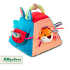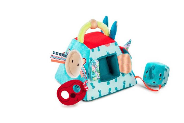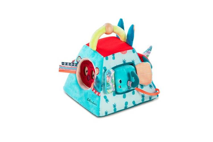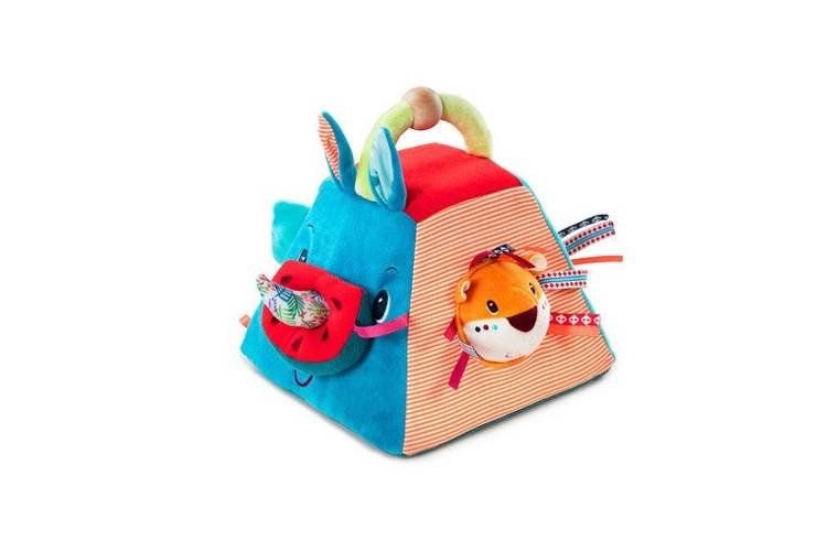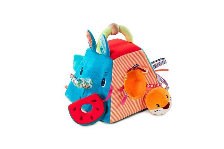 Piramida aktywizująca z kolekcji Nosorożec Marius belgijskiej marki Lilliputiens to niebanalne, miękkie i wielofunkcyjne źródło rozrywki i nauki dla ciekawskich maluszków. Uszyta jest ona z materiałów o różnych wzorach i fakturach oraz posiada wiele ukrytych funkcji. Każda z 4 stron piramidy prezentuje innego z charakterystycznych dla marki bohaterów: róg Nosorożca Mariusa szeleści i można na niego nałożyć pluszową obręcz w kształcie plastra arbuza, głowę Lwa Jacka należy dopasować do okrągłego otworu w ścianie piramidy, maskę Lemura Georga należy umieścić odpowiednio w owalnym otworze, a słonia Alberta – w kwadratowym. Ponadto głowa Lwa Jacka ma w środku dzwoneczek, głowa słonia jest grzechotką, a jego uszy, znajdujące się w ścianie piramidy, szeleszczą. Wszystkie ruchome elementy są przyszyte tasiemką do piramidy, co zapobiega ich zgubieniu. Piramida posiada u góry poręczny uchwyt, ułatwiający jej przenoszenie. Zabawka jest solidnie wykonana i w pełni bezpieczna. Zaskakuje i pobudza dziecięcą wyobraźnię. Rozwija koordynację ręka-oko oraz małą motorykę (chwytanie, potrząsanie, wkładanie, wyjmowanie) oraz aktywizuje zmysł słuchu (dzwonienie, grzechotanie) i uczy rozpoznawania kształtów.