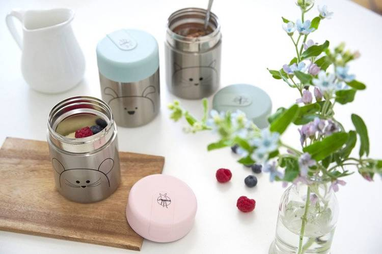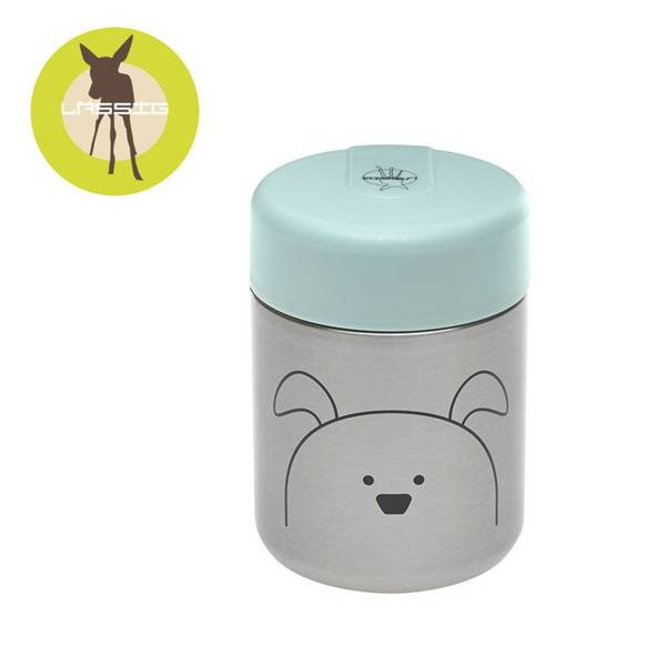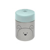 Pojemnik - termos obiadowy niemieckiej marki LASSIG przyda się nie tylko podczas podróży, ale także spacerów czy wycieczek. Termos ma pojemność 315 ml, jest lekki, poręczny i wytrzymały – dzięki podwójnym ściankom ze stali nierdzewnej długo zachowuje temperaturę posiłków, zarówno gorących, jak i zimnych. Szeroki otwór ułatwia napełnianie, podawanie jedzenia i czyszczenie. Hermetyczna jasnoniebieska pokrywka dobrze przylega do pojemnika, posiada także dodatkową silikonową uszczelkę, zapewniającą szczelność naczynia. Pojemnik jest łatwy w obsłudze i ma ergonomiczny kształt – z łatwością zmieści się do plecaka, torebki czy bocznej kieszonki. Ma srebrny kolor z motywem przyjaznej psiej mordki.