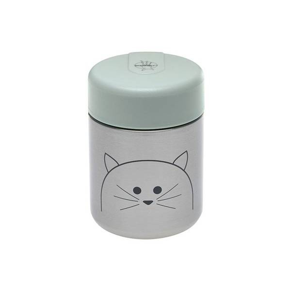 Pojemnik - termos obiadowy niemieckiej marki LASSIG przyda się nie tylko podczas podróży, ale także spacerów czy wycieczek. Termos ma pojemność 315 ml, jest lekki, poręczny i wytrzymały – dzięki podwójnym ściankom ze stali nierdzewnej długo zachowuje temperaturę posiłków, zarówno gorących, jak i zimnych. Szeroki otwór ułatwia napełnianie, podawanie jedzenia i czyszczenie. Hermetyczna oliwkowa pokrywka dobrze przylega do pojemnika, posiada także dodatkową silikonową uszczelkę, zapewniającą szczelność naczynia. Pojemnik jest łatwy w obsłudze i ma ergonomiczny kształt – z łatwością zmieści się do plecaka, torebki czy bocznej kieszonki. Ma srebrny kolor z motywem przyjaznej kociej mordki.
