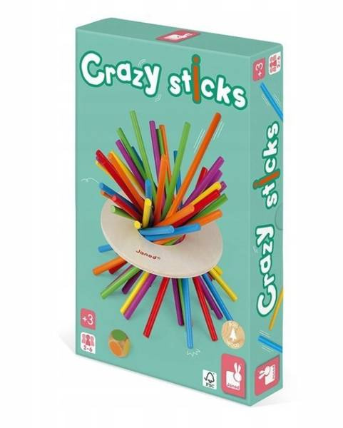 Gra zręcznościowa Zwariowane patyczki francuskiej marki JANOD to wspaniała zabawa dla dwóch do sześciu osób – zarówno dzieci, jak i dorosłych. Zestaw zawiera 36 cienkich drewnianych patyczków w 6 kolorach, drewnianą kostkę z polami w tych samych kolorach, co patyczki oraz – również drewniany – dysk z otworem w środku. W otworze tym umieszcza się patyki i wyciąga je kolejno zgodnie z kolorami, wyrzuconymi na kostce, uważając jednak, aby dysk nie dotknął stołu. Celem gry jest wyciągnięcie jak największej liczby patyczków, zanim dysk opadnie. Gracz, który doprowadzi do jego upadku – przegrywa.
