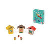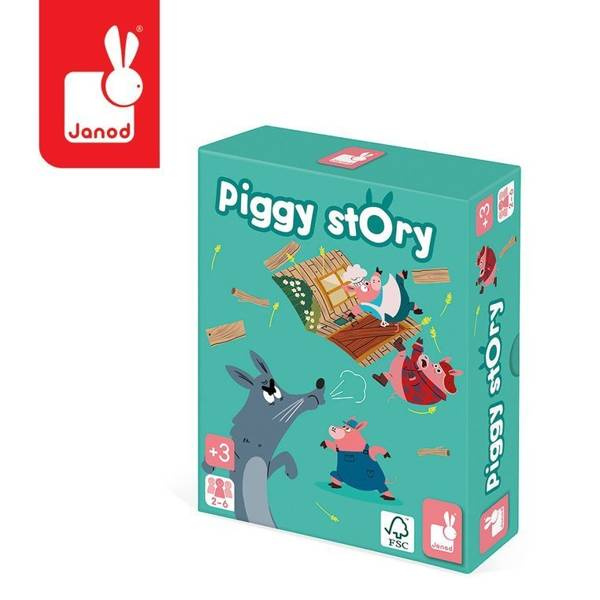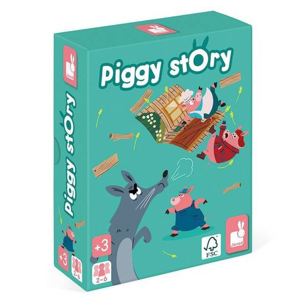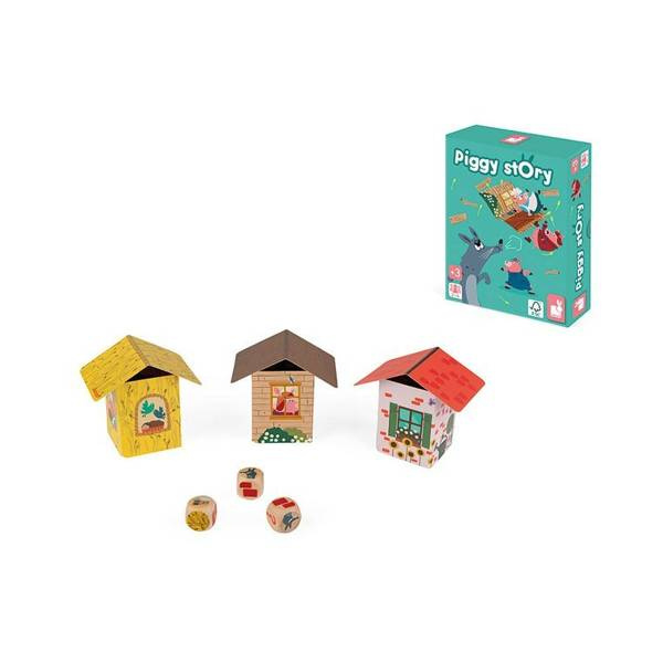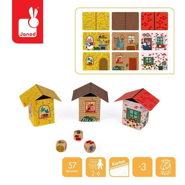 Gra zręcznościowa Trzy świnki francuskiej marki JANOD to wspaniała zabawa dla dwóch do sześciu osób – zarówno dzieci, jak i dorosłych. Zestaw zawiera 54 karty, wykonane z solidnego kartonu, z których buduje się ściany (36 kart) i dachy (18 kart) domków dla świnek – zgodnie z rysunkami na kartach - ze słomy, drewna lub cegły. Przebieg gry wyznaczają rzuty 3 drewnianymi kostkami. Gracze mają za zadanie zbudować trzy domki, każdy z innego materiału, wykazując się sprytem i unikając wilka, który może im te domki zdmuchnąć. Czasami jednak sami się w wilka wcielają, próbując zdmuchnąć domki przeciwników. Wygrywa gracz, który jako pierwszy ukończy budowę wszystkich trzech domków.