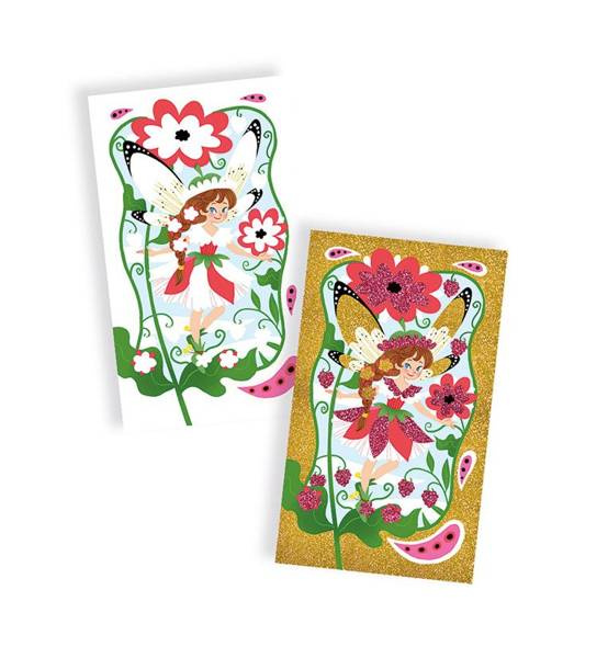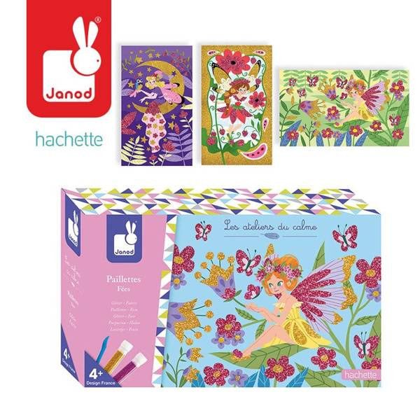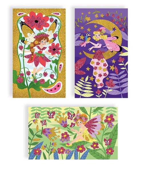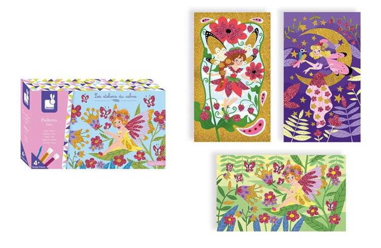 Zestaw kreatywny Magiczny brokat Wróżki francuskiej marki JANOD zawiera 3 plansze-obrazki z powłoką samoprzylepną, z wróżkami w otoczeniu kwiatów i bajecznej roślinności. Ilustracje te można – w wyznaczonych miejscach – posypać dołączonym do zestawu brokatem w tubkach, w 2 kolorach: złotym i bordowym. Brokat przykleja się do obrazków, pozostawiając na nich drobną strukturę. W komplecie znajduje się też szpatułka do odkrywania powierzchni, przeznaczonych do ozdabiania. Przyklejanie to dla dziecka długie godziny angażującej i jednocześnie uspokajającej, wyciszającej zabawy, a gotowe obrazki staną się wspaniałym elementem dekoracyjnym dziecięcego pokoju.