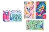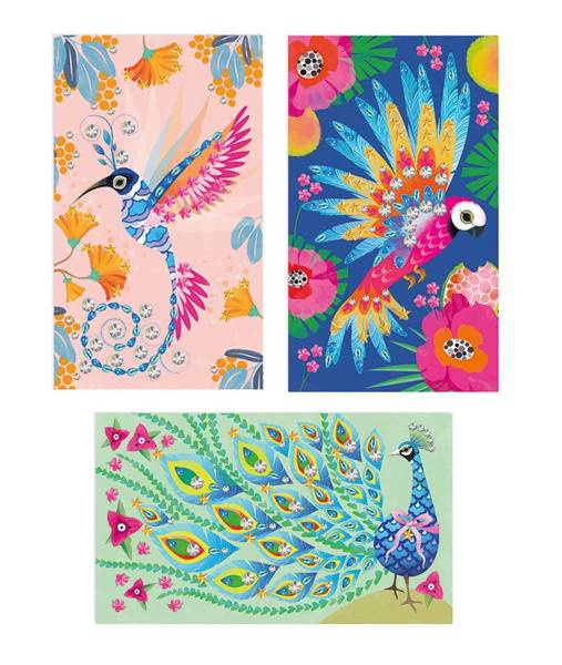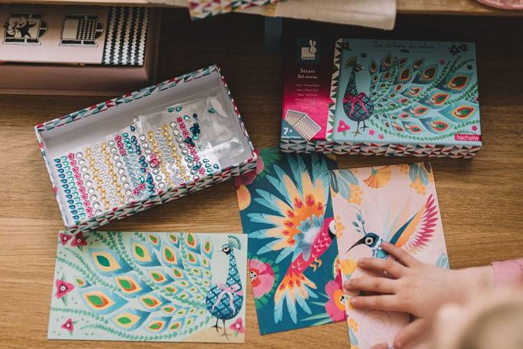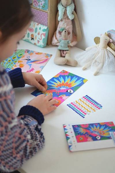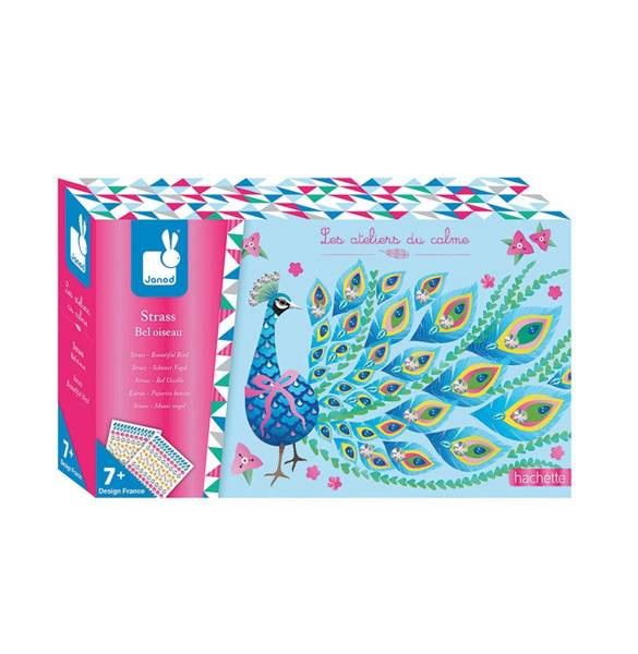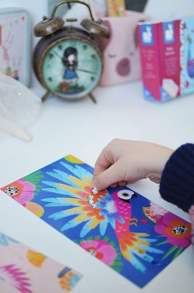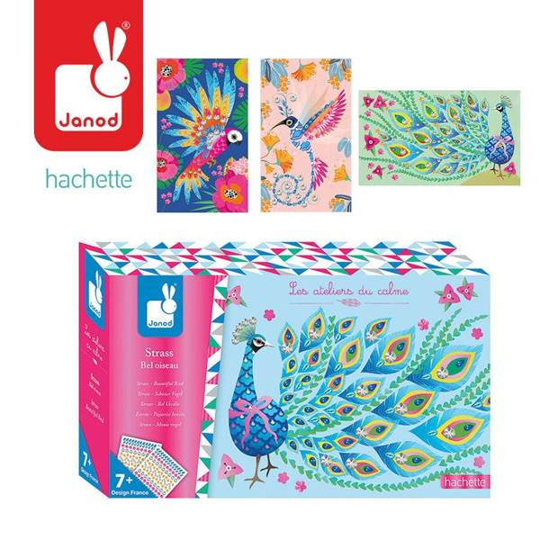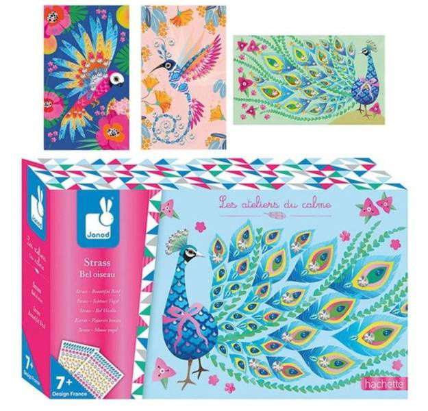 Zestaw kreatywny Czarodziejskie cyrkonie Piękne ptaki francuskiej marki JANOD zawiera 3 plansze-obrazki z zachwycająco barwnymi: pawiem, kolibrem i papugą. Do ilustracji tych można – zarówno w sugerowanych miejscach, jak i dowolnie – przyklejać dołączone do zestawu błyszczące cyrkonie (2 arkusze). Naklejanie to dla dziecka długie godziny angażującej i jednocześnie uspokajającej, wyciszającej zabawy, a gotowe obrazki staną się wspaniałym elementem dekoracyjnym dziecięcego pokoju.