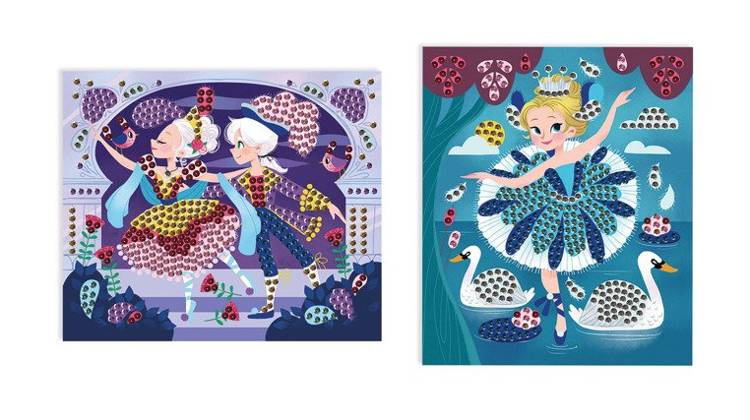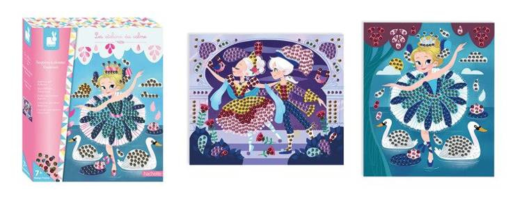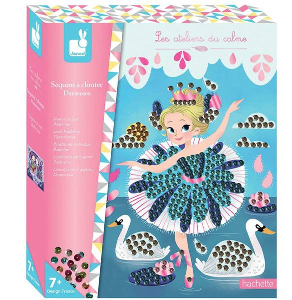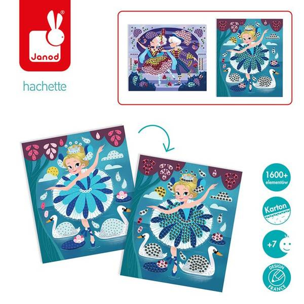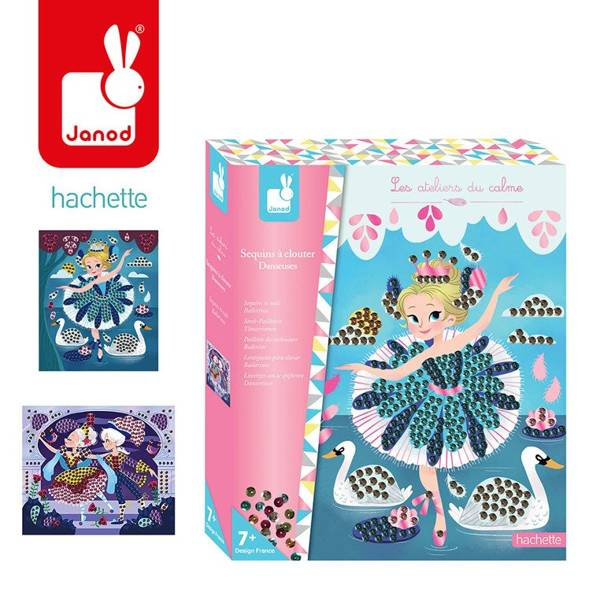 Zestaw kreatywny Urokliwe cekiny Baletnice francuskiej marki JANOD zawiera 2 kartonowe obrazki podklejone pianką, przedstawiające baletnice podczas występów na scenie. Ilustracje te można ozdobić, wpinając w nie – zarówno w sugerowanych miejscach, jak i dowolnie – dołączone do zestawu cekiny. Jest ich aż 800 w 7 różnych kolorach. Do zestawu są również dołączone mini-szpileczki do mocowania cekinów. Przypinanie cekinów to dla dziecka długie godziny angażującej i jednocześnie uspokajającej, wyciszającej zabawy, a gotowe obrazki staną się wspaniałym elementem dekoracyjnym dziecięcego pokoju.