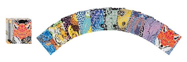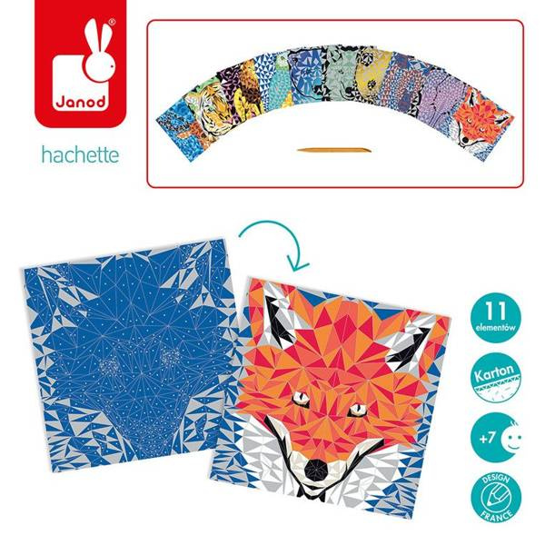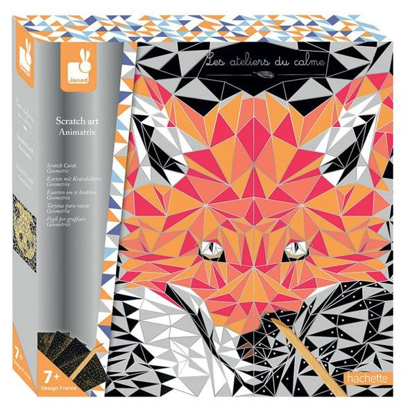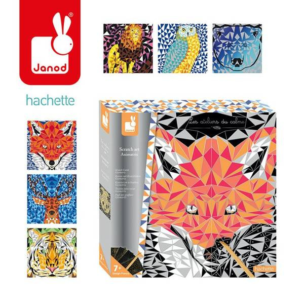 Zestaw kreatywny Do zdrapywania Animetrics francuskiej marki JANOD zawiera 10 kwadratowych plansz-obrazków z kartonu, które przedstawiają lisa, wilka, słonia, zebrę, pandę, niedźwiedzia, papugę, lwa, tygrysa i jelenia. Obrazki są monochromatyczne, jedynie z graficznymi konturami zwierząt, które ukazują się stopniowo w efekcie zdrapywania wierzchniej warstwy. Finalnie postacie te są kolorowe i stworzone z wielu figur geometrycznych, głównie trójkątów. Do zestawu dołączony jest drewniany patyczek do zdrapywania. Zdrapywanie to dla dziecka długie godziny angażującej i jednocześnie uspokajającej, wyciszającej zabawy, a gotowe obrazki staną się wspaniałym elementem dekoracyjnym dziecięcego pokoju.