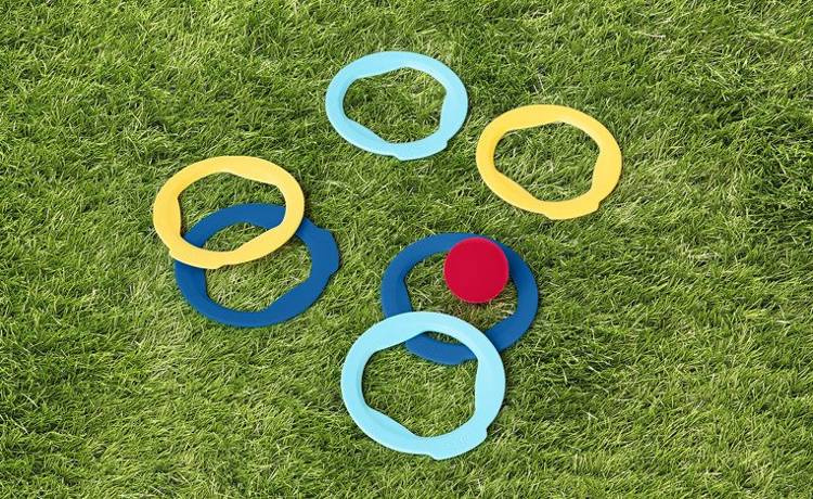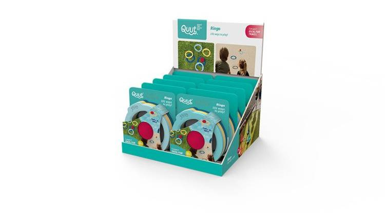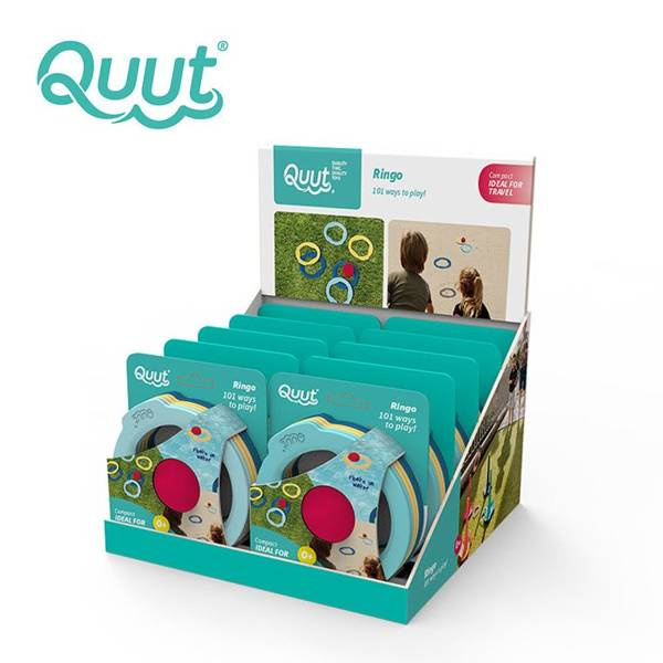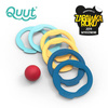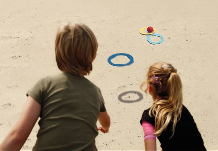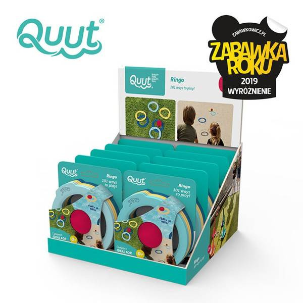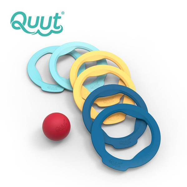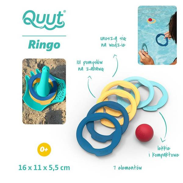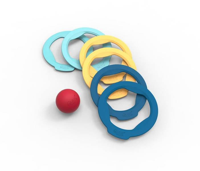 Gra Ringo belgijskiej marki Quut przyciąga wzrok niebanalnym designem i oryginalną kolorystyką. Składa się z 6 lekkich i łatwych do utrzymania przez dziecko kółek z tworzywa – po 2 w kolorach jasnoniebieskim, ciemnoniebieskim i żółtym, oraz sprężystej wiśniowej piłeczki. Kółka mają aerodynamiczną konstrukcję, ich kolorystyka gwarantuje maksymalną widoczność na każdej powierzchni, a miękkie krawędzie zapewniają bezpieczeństwo młodym graczom. Co więcej, unoszą się one na wodzie, co znacząco powiększa obszar pomysłów do zabawy i zastosowań zestawu. Gra Ringo doskonale łączy się z innymi zabawkami marki Quut, np. łopatkami wielofunkcyjnymi Triplet i Cuppi. Gwarantuje inteligentną aktywność w domu i na świeżym powietrzu, i to przez cały rok. Sprawdzą się bowiem nie tylko do zabaw w piasku (na plaży czy w piaskownicy), ale także w wodzie (w wannie), śniegu czy ogrodzie.
