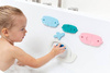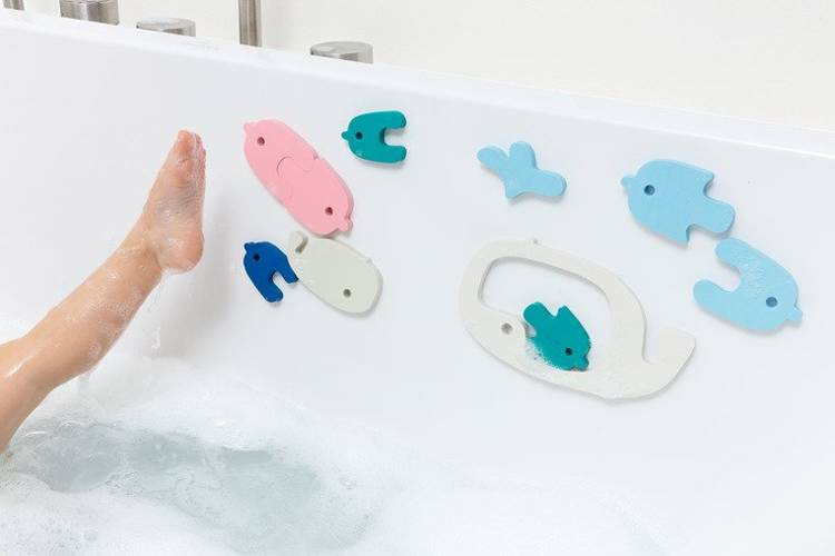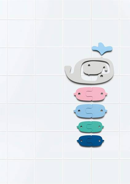 Zestaw puzzli piankowych Wieloryb z kolekcji Quutopia belgijskiej marki Quut to innowacyjna zabawka do kąpieli, która zadziwia pomysłowością, rozwija kreatywność, przyciąga wzrok niebanalnym designem i oryginalną kolorystyką. Komplet składa się z 11 puzzli: 2 wielorybów (małego i dużego), 8 rybek (większych i mniejszych) i wodnej fontanny, wykonanych z wyjątkowego materiału, jakim jest pianka EVA, w intensywnych barwach (chabrowy, turkus, niebieski, jasny szary i różowy). Kształty puzzli umożliwiają łączenie ich na różne sposoby (np. rybki można łączyć w pary kolorystyczne, lub umieszczać wewnątrz dużego wieloryba mniejsze elementy), a po zamoczeniu można przyklejać je do powierzchni wanny lub glazury, tworząc przeróżne konstrukcje, oraz bawić się w sposób, jaki tylko podpowie dziecku wyobraźnia. Figurki unoszą się na wodzie, są lekkie i szybkoschnące.