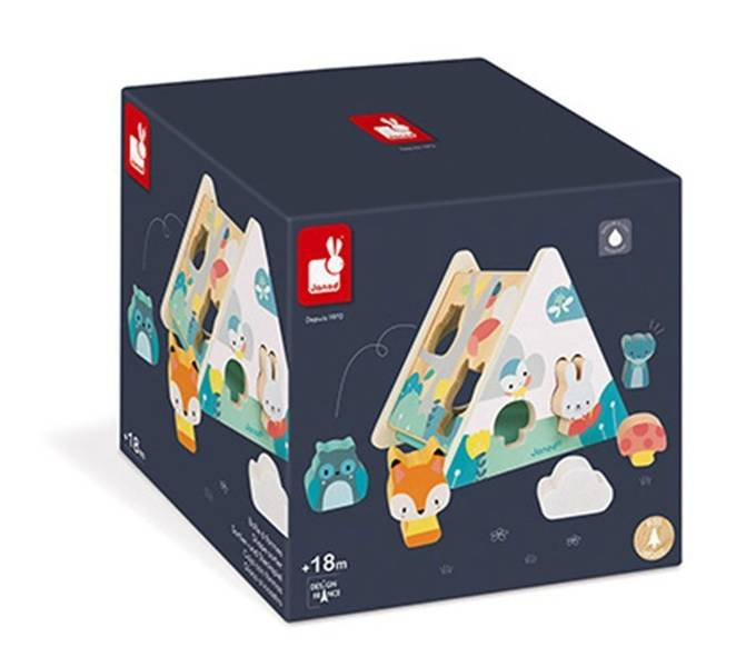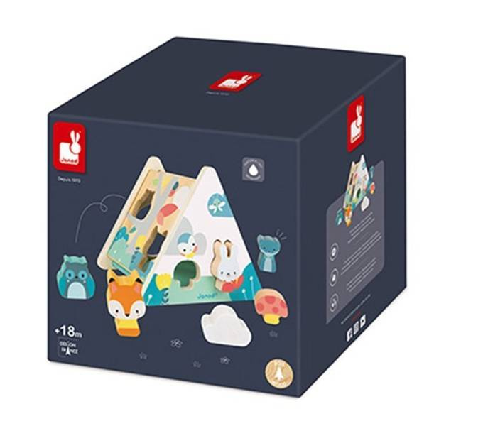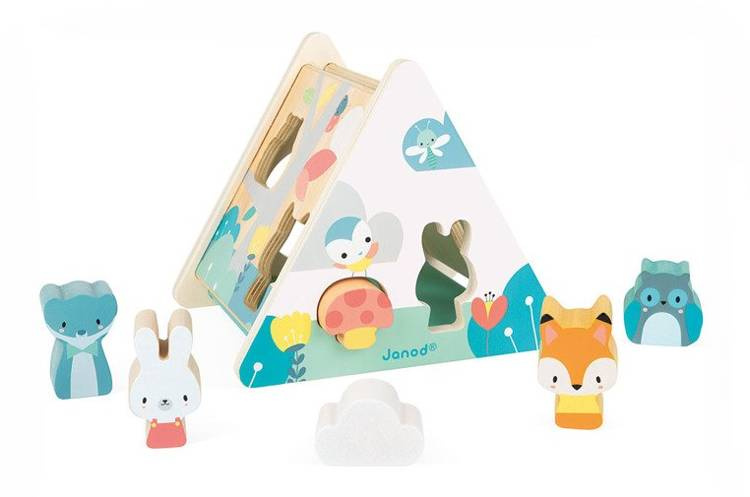 Sorter kształtów z serii Pure francuskiej marki Janod rozwija u dziecka wiele kluczowych umiejętności, m.in. rozróżnianie i dopasowywanie kształtów czy tzw. małą motorykę. Zabawka uczy koncentracji, spostrzegawczości, a także cierpliwości. Zestaw składa się z drewnianej bryły o bokach w kształcie trójkąta (dominują na nim kolory biały i niebieski, jak w całej serii Pure), na której ścinach znajduje się 6 otworów w różnych kształtach (m. in. grzybka, chmurki, sowy czy królika) oraz z 6 drewnianych klocków w kształtach, odpowiadającym wspomnianym otworom. Wrzucone klocki bardzo łatwo wyjąć ze środka, bo jeden bok sortera jest częściowo otwarty.