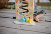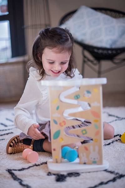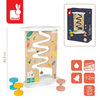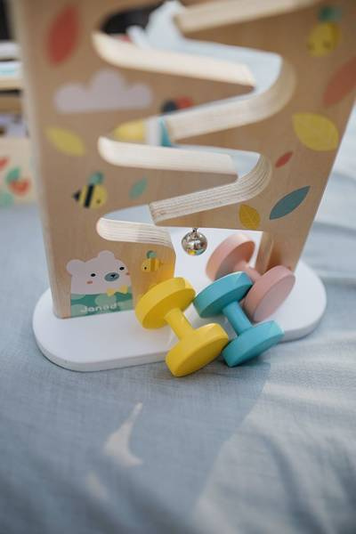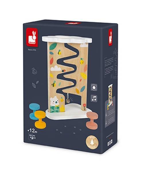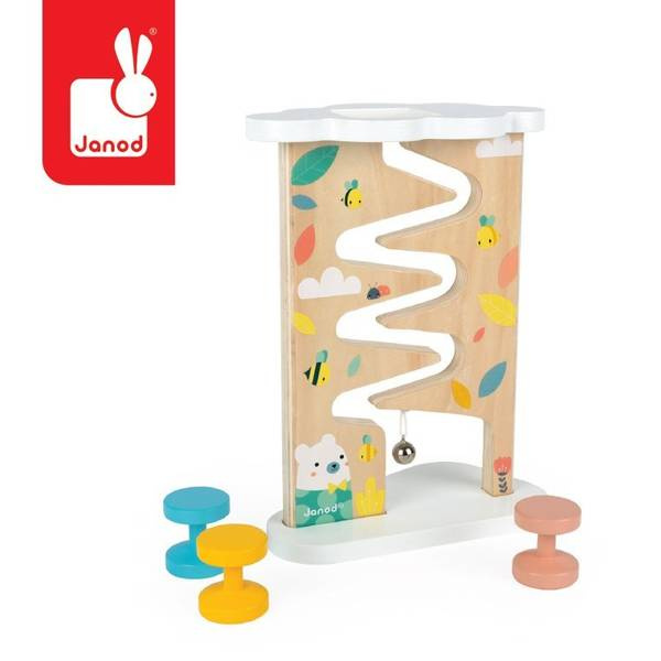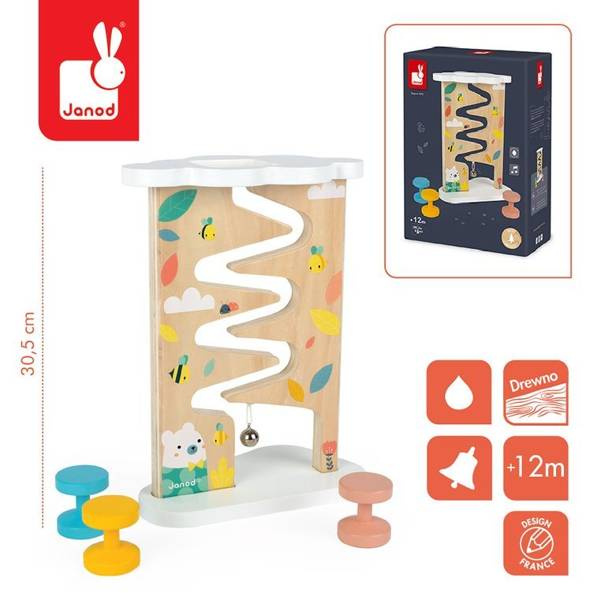 Drewniany tor zjeżdżalnia francuskiej marki JANOD to idealna zabawka dla dzieci od 1. roku życia. Przez otwór w górnej części w pętli umieszcza się klocek – w kształcie mini-sztangi z okrągłymi bokami (w komplecie są 3 sztuki), który następnie opada w dół toru. Na końcu swojej drogi, uderza on w dzwoneczek. Przesuwając elementy maluch rozwija koordynację ruchową i motorykę, a także uczy się logicznego myślenia. Tor ma piękne pastelowe kolory, które zaciekawiają i zachęcają dziecko do zabawy. Wszystkie elementy są wygodne do trzymania w małych rączkach. Zabawka jest umieszczona na podstawce. Jest w pełni bezpieczna dla dziecka.
