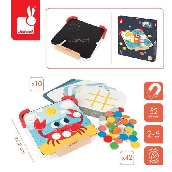 Układanka magnetyczna Uczę się kolorów francuskiej marki JANOD to idealny sposób na naukę i zabawę w jednym. W zestawie znajduje się drewniana tabliczka magnetyczna z podstawkami, 42 kolorowe magnetyczne kółka, 10 dwustronnych obrazków z zadaniami oraz kreda. Na tabliczce można pisać i rysować za pomocą kredy, a także umieszczać na niej ilustracje i wypełniać polecania, używając magnesów w odpowiednich kolorach.