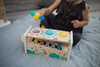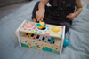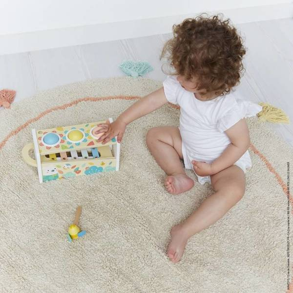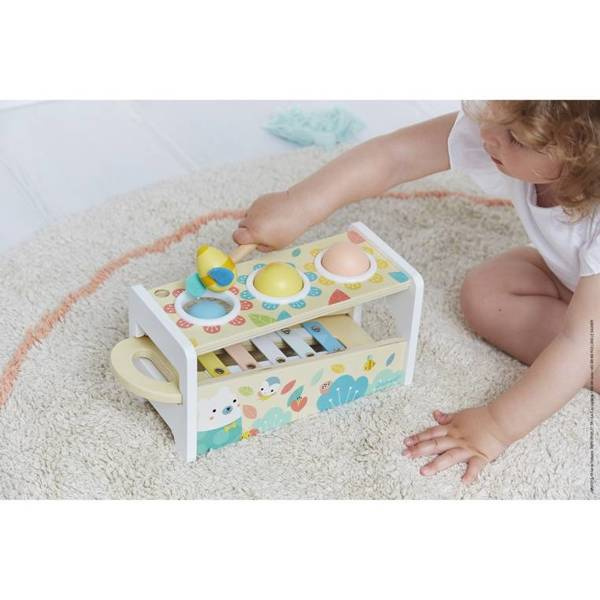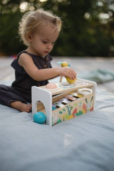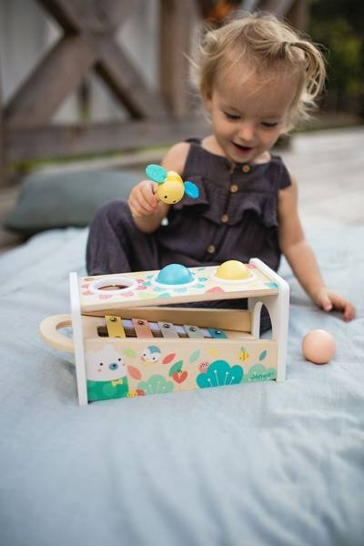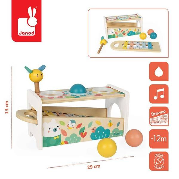 Drewniane cymbałki z kulodromem z serii Pure francuskiej marki JANOD to idealna pierwsza zabawka muzyczna dla dziecka, która pomaga rozwijać słuch, poczucie rytmu oraz zdolności muzyczne, a przy tym wielofunkcyjna zabawka, która nieprędko się znudzi. Konstrukcja ma dwa poziomy – na dolnym, pod kątem umieszczone są cymbałki z metalowymi płytkami, a powyżej niego znajdują się trzy otwory na kulki. Za pomocą drewnianej pałeczki, zakończonej żółtą pszczółką z filcowymi skrzydełkami, można zarówno wystukiwać rytm na blaszkach ksylofonu, jak również wbijać do środka kulki, które opadną na klawisze i stoczą się po nich w dół, jak w kulodromie. Cymbałek i kulodromu można również używać osobno. Zabawka wspiera rozwój wyobraźni, koncentracji i koordynacji ruchowej. Ma piękną pastelową kolorystykę, a na pudełku namalowane są charakterystyczne dla kolekcji Pure leśne zwierzątka.