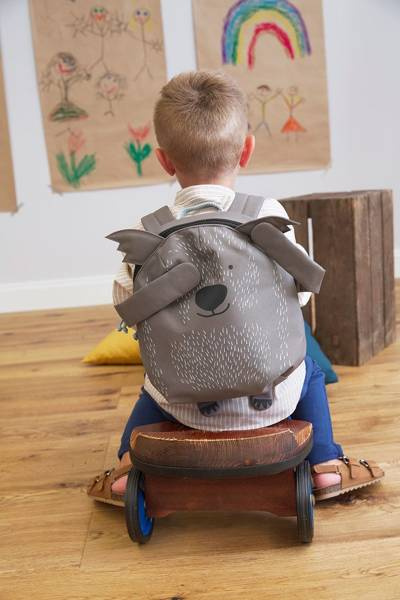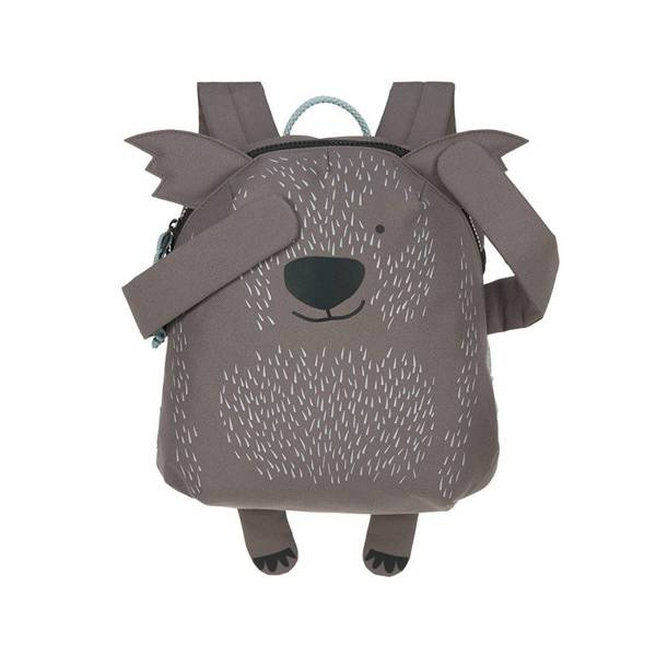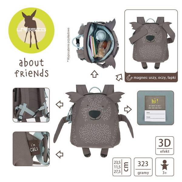 Wyjątkowo uroczy plecak 3D w kształcie wombata niemieckiej marki LASSIG. Funkcjonalny, lekki i wygodny, idealny do przedszkola i na wycieczki. Wombat Cali ma piękny brunatny kolor, charakterystyczne uszy, długie łapki i białe futerko, namalowane na tkaninie. W łapach, oczach, uszach i ustach znajdują się magnesy, dzięki którym można te części przykładać do siebie, tworząc miny czy gesty zwierzątka. Przestronna komora główna zapinana jest na suwak, posiada wewnętrzną kieszeń na butelkę z napojem oraz etykietkę z wizytówką, na której można zapisać imię dziecka i numer kontaktowy rodzica. Z tyłu na zewnątrz znajduje się także dodatkowa komora na zamek, a na dole – metka z imieniem zwierzaczka. Plecak uszyto z wysokiej jakości, trwałych materiałów, tylna ścianka jest lekko wzmocniona, ale nadal miękka w kontakcie z plecami dziecka. W górnej części znajduje się uszko do zawieszenia plecaka, np. na haczyku w szatni. Dość szerokie, grubsze i miękkie ramiączka zapewniają wygodę noszenia. Z przodu, na klatce piersiowej dodatkowo wyposażone są z w stabilizujące i odciążające plecy zapięcie na zatrzask – jego wysokość, podobnie jak długość ramiączek, można regulować i na bieżąco dopasowywać do wzrostu dziecka. Uszko, paski oraz ułatwiające dziecku samodzielne zapinanie sznureczki przy suwakach mają kolor bladoniebieski. Materiał plecaka łatwo się czyści i jest odporny na wilgoć.