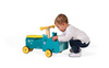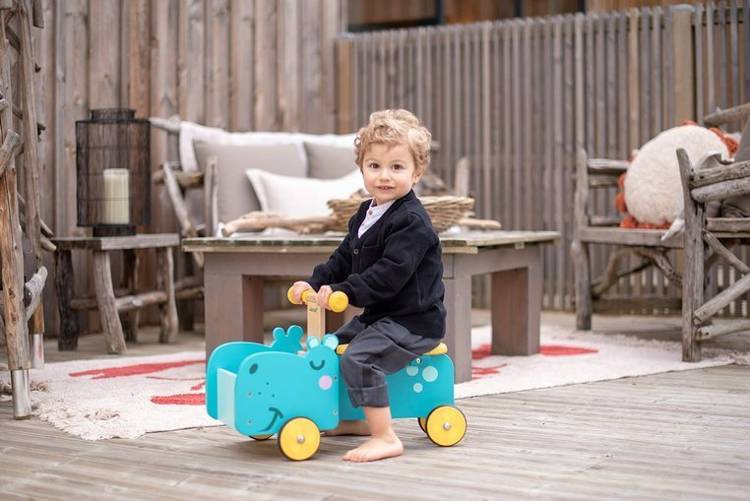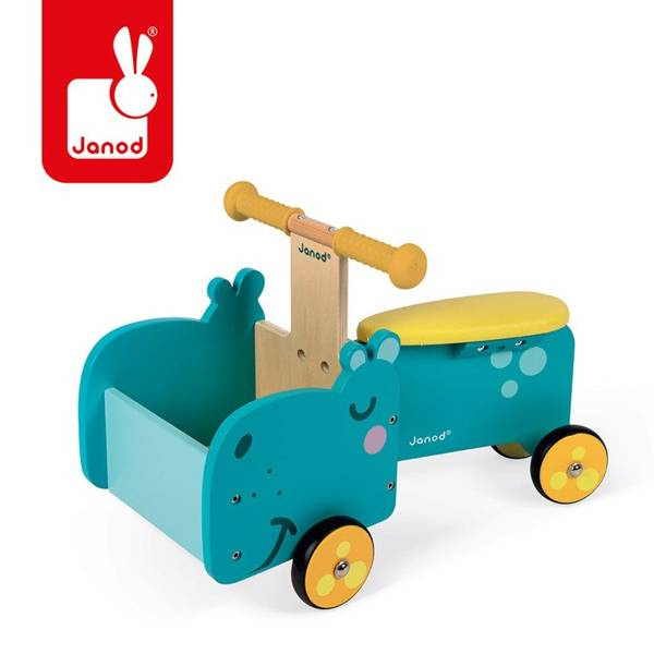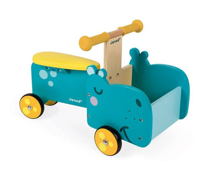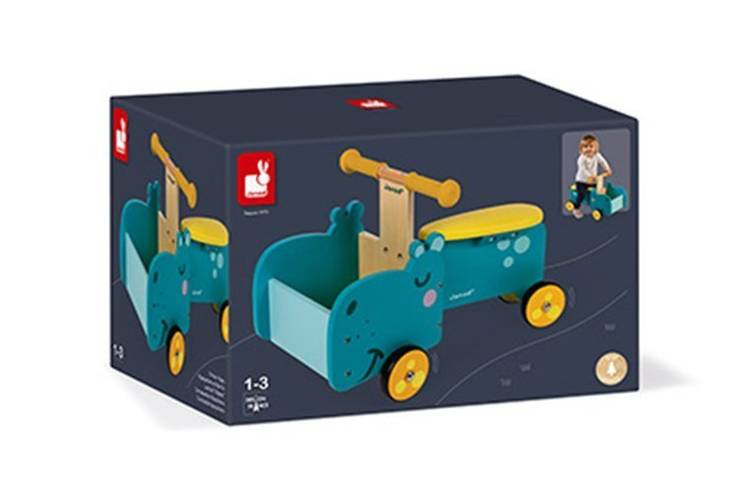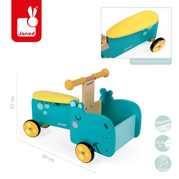 Jeździk drewniany Hipopotam francuskiej marki JANOD to idealna zabawka do domu i na dwór. Wspiera dziecko w rozwoju ruchowym. Starannie wykonany, z najlepszej jakości materiałów i ogromną dbałością o estetykę. Wyglądem przypomina hipopotama. Jego ergonomiczna budowa i odpowiednia wysokość podłużnego miękkiego siedziska (24 cm) ułatwia dziecku samodzielne wsiadanie i zsiadanie oraz wygodę jazdy, a lekka konstrukcja sprawia, że jest łatwy w prowadzeniu i utrzymywaniu w równowadze. Stabilne, szeroko rozstawione kółka dodatkowo wykończone są gumą, dzięki czemu nie rysują podłogi w domu. Jeździk posiada także miękkie, antypoślizgowe uchwyty przy kierownicy. Dzięki dużej skrzyni z przodu (głowa hipopotama) może również służyć do przechowywania i przewożenia zabawek. Drewniana rama i skrzynia jeździka są w kolorach turkusowym i niebieskim, kierownica ma naturalną barwę drewna, a wykończenie siedziska, uchwyty i kółka – ciepły odcień żółtego. Jazda takim pojazdem nauczy Twoje dziecko utrzymywania równowagi i koordynacji. Jest to również doskonały sposób na rozpoczęcie nauki jazdy na rowerku. Jeździk został zaprojektowany we Francji. Zapakowany jest w estetyczne, kartonowe pudełko. Idealnie nadaje się na prezent.