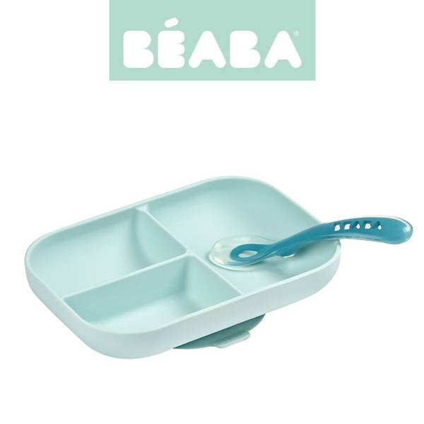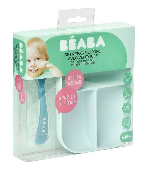 Komplet naczyń z silikonu francuskiej marki BEABA składa się ze sporego trójdzielnego talerzyka-miseczki i łyżeczki treningowej. Wszystkie elementy zestawu charakteryzuje ergonomiczny, zaokrąglony kształt i miękkie, gładkie brzegi. Podział talerza na trzy przestrzenie (150 ml + 90 ml + 90 ml) pozwala podzielić posiłek na porcje, co ułatwi malcowi naukę samodzielnego jedzenia, oraz właściwe komponowanie posiłków. Wyższe boki pomagają dziecku samodzielnie nabierać jedzenie. Naczynie ma na spodzie antypoślizgową przyssawkę, dzięki czemu jest stabilne i dobrze trzyma się stołu. Łyżeczka idealnie dopasowuje się do dziecięcej buzi i można ją odłożyć tak, by główka nie dotykała powierzchni, dzięki czemu jej używanie jest o wiele bardziej higieniczne.