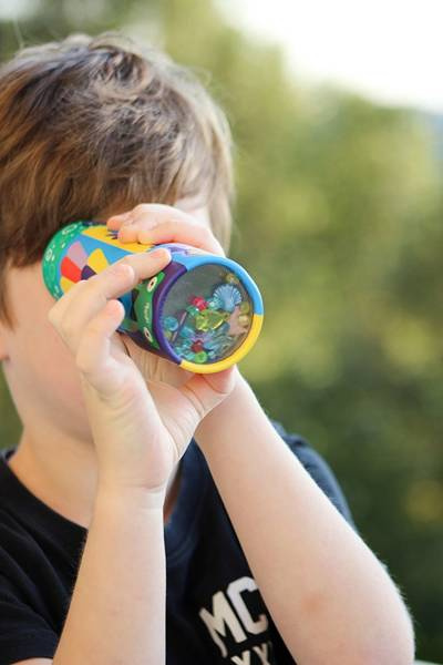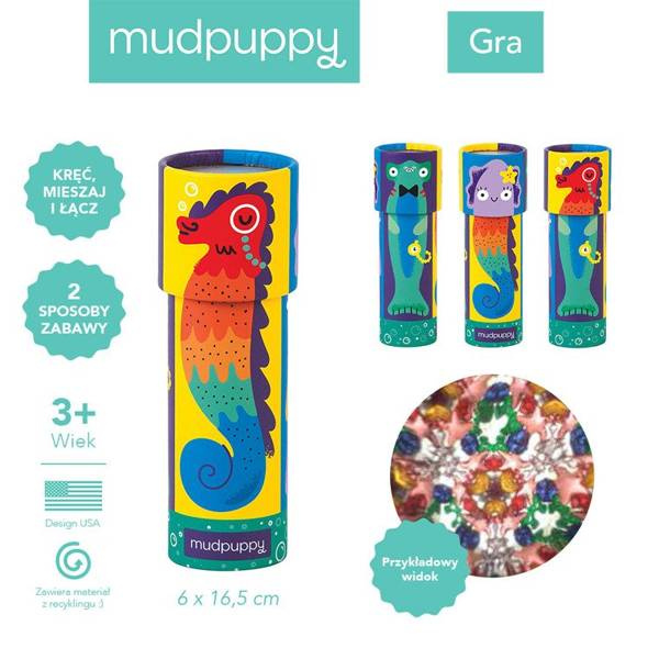 Kalejdoskop Mix&Match Morskie stworzenia amerykańskiej marki MUDPUPPY to niebanalna zabawka, która daje wiele możliwości. Oprócz wciągających, stymulujących pracę oka obserwacji barwnych, symetrycznych figur, zmieniających się przy każdym obrocie kalejdoskopu, na jego zewnętrznej stronie znajdują się trzy dwuelementowe układanki z postaciami uroczych zwierzaków – konika morskiego, ryby młot i ośmiornicy, które można komponować (góra + dół) w dowolny sposób. Autorką ilustracji jest Emily Balsley – artystka z Wisconsin. Kalejdoskop przypomina lunetę, ma kształt rurki, jest wykonany z kartonu i wygląda bardzo estetycznie. Idealnie nadaje się na prezent.