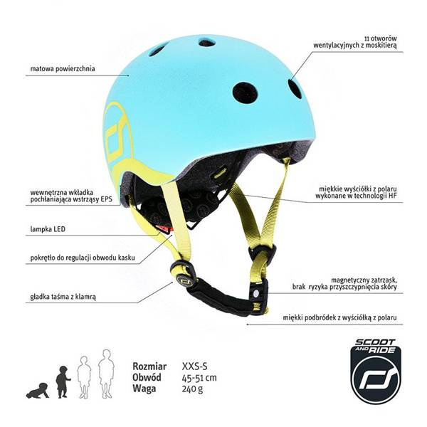Kaski są wyposażone w innowacyjne bezpieczne magnetyczne zapięcie pod szyją, dzięki któremu nie ma ryzyka przyszczypnięcia skóry oraz komfortowy polarowy podbródek. Gładkie boczne taśmy z regulacją pozwalają dokładnie dopasować kask do główki dziecka. Wnętrze kasku wypełnia wkładka EPS pochłaniająca wstrząsy, a w skorupie znajduje się 11 otworów wentylacyjnych z moskitierą, co gwarantuje doskonałą cyrkulację powietrza i zapobiega poceniu się główki. Dla większej wygody wnętrze kasku wyposażone jest ponadto w poduszeczkę w okolicach karku dziecka, ma miękkie krawędzie i wypełnienie (wykonane w technologii HF). Z tyłu, przy regulacji obwodu głowy, kask wyposażony jest w czerwoną lampkę LED z trzema trybami świecenia (ciągłym i dwoma migającymi). Sprawdzi się on doskonale podczas jazdy na jeździku, hulajnodze, rowerku biegowym czy rowerze i będzie służył Twojemu aktywnemu dziecku przez wiele lat. Jest idealnym uzupełnieniem Highwaykick1 w kolorach Blueberry i LemonNajważniejsze cechy kasku Scoot & Ride XXS-S: