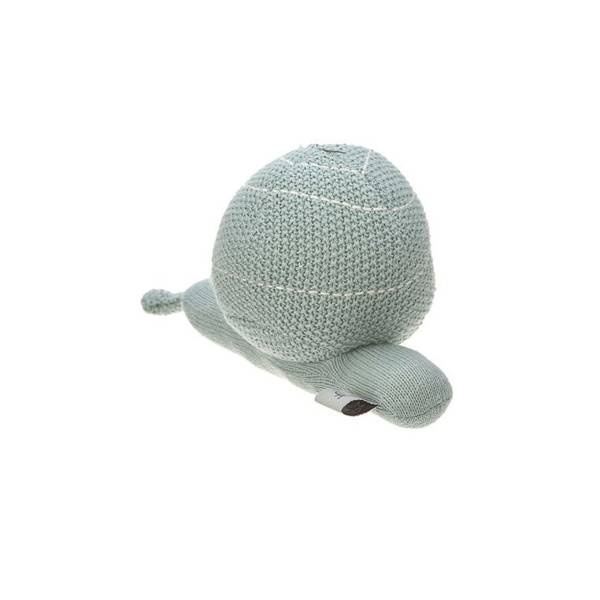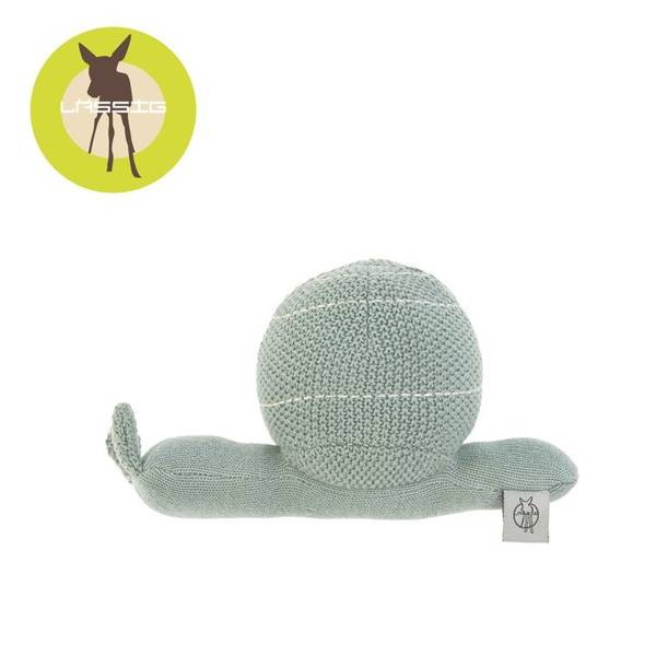 Śliczna i praktyczna dziergana przytulanka z grzechotką niemieckiej marki LASSIG to idealna pierwsza zabawka nie tylko dla małych miłośników przyrody. Miękki, urokliwy ślimak z różkami i muszelką-domkiem na grzbiecie w kolorze szarozielonym wykonany został z wegańskiej bawełny organicznej. Jest bardzo przyjemny w dotyku, a przy potrząsaniu wydaje miły dla ucha dźwięk. Zabawa nim stymuluje dziecięcy zmysł słuchu i dotyku, trenuje chwyt oraz koordynację ręka-oko. Rozmiarami jest idealnie dopasowany do małych rączek.
