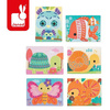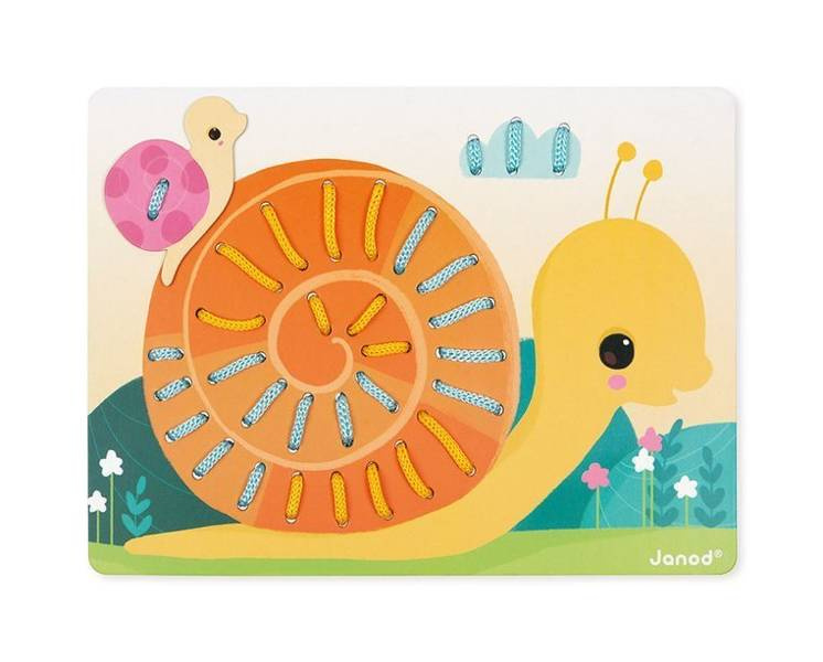 Zabawka manipulacyjna – przeplatanka Zwierzątka francuskiej marki JANOD składa się z 6 plansz – obrazków, wykonanych z solidnego kartonu i przedstawiających: wiewiórkę, sówki, rybki, motyla, ślimaki i żółwie. Plansze te posiadają wiele otworów, przez które należy przepleść dołączone do nich sznurki (po dwa), ozdabiając obrazek, oraz element dodatkowy, np. orzeszek lub kwiatek, który trzeba przymocować do każdej z nich w odpowiednim miejscu. Przeplatając sznurki dziecko rozwija koordynację ruchową i motorykę, poznaje kolory i uczy logicznego myślenia. Plansze zaciekawiają i zapewniają długie godziny angażującej zabawy, a gotowe obrazki mogą stać się elementem dekoracyjnym dziecięcego pokoju lub zostać użyte ponownie, w jeszcze bardziej twórczy sposób. Zestaw zaprojektowano we Francji. Idealnie nadaje się na prezent.