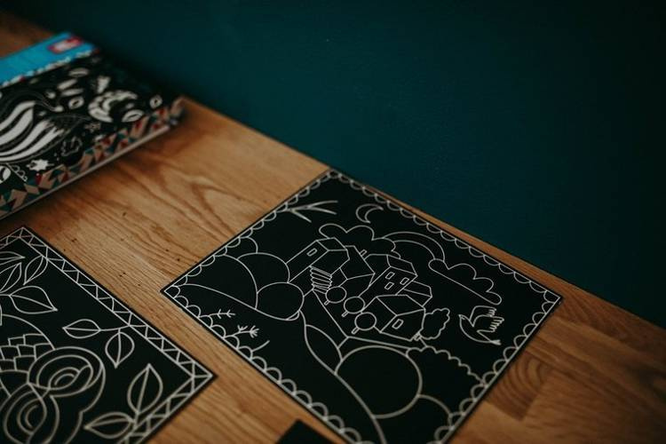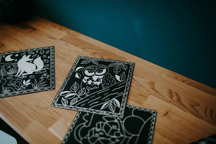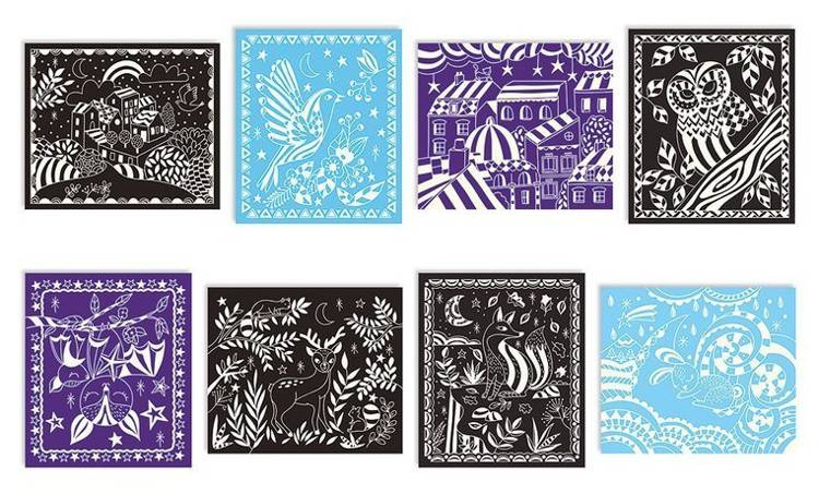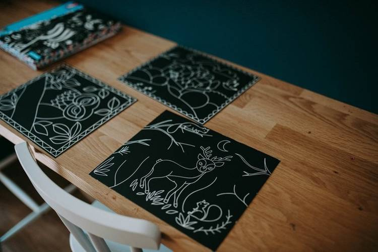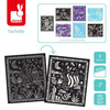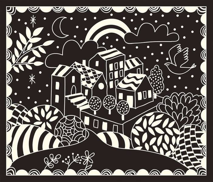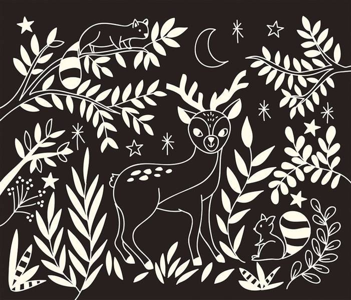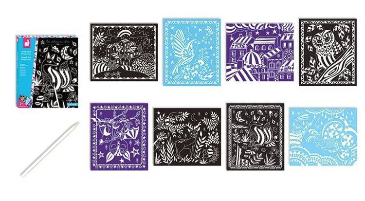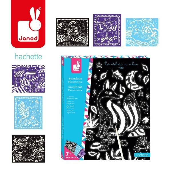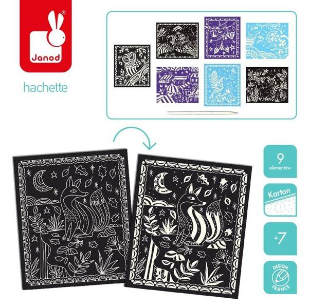 Zestaw kreatywny Do zdrapywania Karty świecące w ciemności francuskiej marki JANOD zawiera 8 plansz z solidnego kartonu, przedstawiających ilustracje z budynkami i nocnymi zwierzętami, np. nietoperzem czy sową. Obrazki są pokryte jednobarwną warstwą wierzchnią, jedynie z konturami fluorescencyjnych elementów, które należy zdrapać za pomocą dołączonego do zestawu patyczka. Odkryte powierzchnie świecą w ciemności. Zdrapywanie to dla dziecka długie godziny angażującej i jednocześnie uspokajającej, wyciszającej zabawy, a gotowe dzieła mogą stać się wspaniałą dekoracją dziecięcego pokoju. Zestaw zaprojektowano we Francji we współpracy z francuską grupą mediową i wydawniczą Hachette. Zapakowany jest w stylowe kartonowe pudełko. Idealnie nadaje się na prezent.