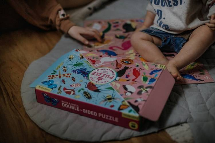 Puzzle dwustronne Robaki i ptaki amerykańskiej marki MUDPUPPY nadają układaniu puzzli nowy wymiar – na samym złożeniu sporego obrazka (o wymiarach 55 x 42 cm) zabawa się bowiem nie kończy. Po obróceniu go okazuje się bowiem, że na drugiej stronie powstała kolejna, zupełnie nowa ilustracja! Następnym razem dziecko może zacząć układanie właśnie od niej. Jedna strona puzzli przedstawia wiele gatunków ptaków na różowym tle, druga – mnóstwo różnorodnych owadów na tle niebieskim. Niebanalny design i piękne kolory dodatkowo zachęcają do zabawy. Taka układanka to również świetny sposób na pierwsze lekcje przyrody i poznanie ciekawych stworzeń.