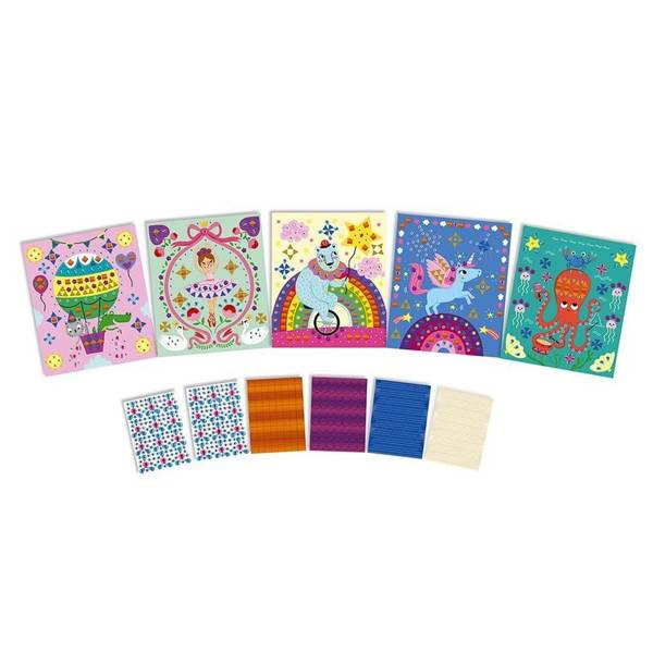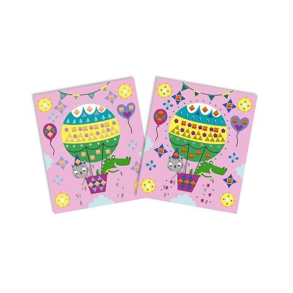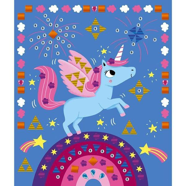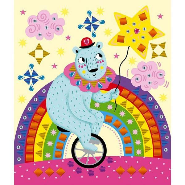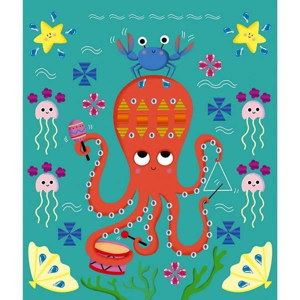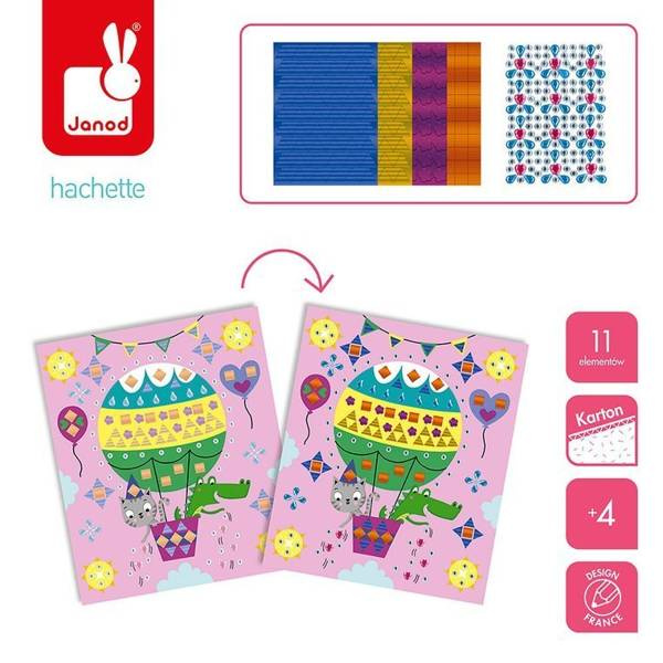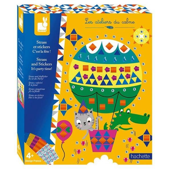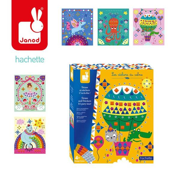 Zestaw kreatywny Kryształki i naklejki Fiesta francuskiej marki JANOD zawiera 5 plansz-obrazków, przedstawiających różnego rodzaju zabawy: urodzinowy lot balonem, balet, dyskotekę jednorożców, cyrkowe akrobacje i przyjęcie pod powierzchnią oceanu. Ilustracje te można ozdobić, naklejając – w wyznaczonych miejscach – kolorowe kryształki i naklejki o niebanalnych kształtach. W komplecie znajduje się 6 arkuszy drobnych aplikacji. Naklejanie to dla dziecka długie godziny angażującej i jednocześnie uspokajającej, wyciszającej zabawy, a gotowe obrazki staną się wspaniałym elementem dekoracyjnym dziecięcego pokoju.