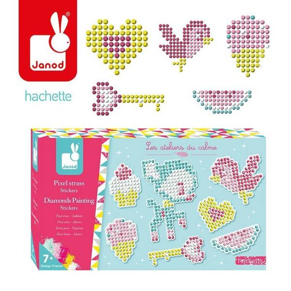 Zestaw kreatywny Cudowne kryształki Naklejki francuskiej marki JANOD zawiera 5 obrazków-naklejek o różnych kształtach, przedstawiających: jelonka, ptaszka, muffinkę, serce, cząstkę arbuza, loda w wafelku i klucz. Ilustracje można ozdobić, naklejając – zarówno w sugerowanych miejscach, jak i dowolnie – dołączone do zestawu mini-kryształki w różnych kolorach i kształtach. Jest ich aż 750! Gotowe dzieła można przykleić. Naklejanie to dla dziecka długie godziny angażującej i jednocześnie uspokajającej, wyciszającej zabawy, a gotowe obrazki staną się wspaniałym elementem dekoracyjnym dziecięcego pokoju.