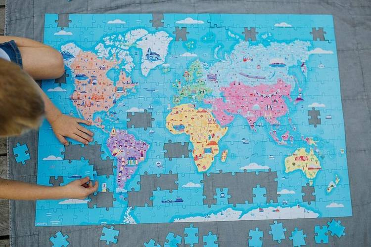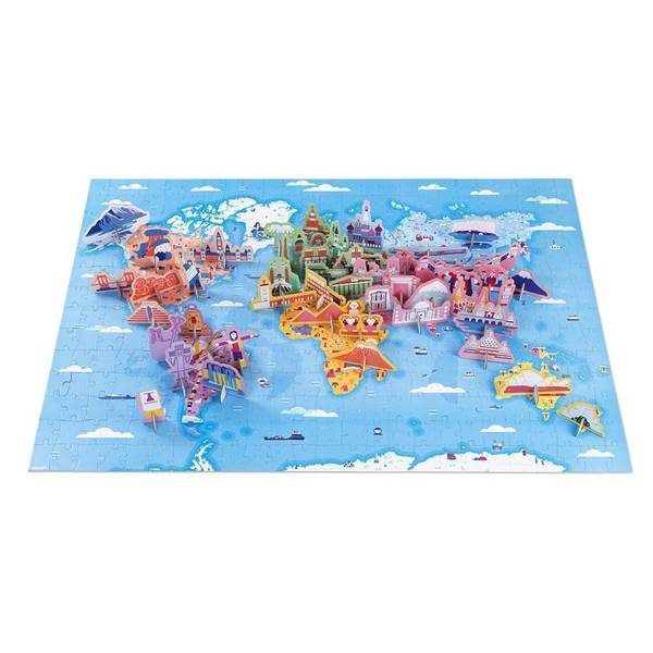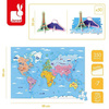 Puzzle edukacyjne Zabytki i cuda świata francuskiej marki JANOD składają się z 350 elementów, które po ułożeniu tworzą wielką mapę, prezentującą najbardziej niezwykłe rzeczy, jakie można zobaczyć na świecie, zarówno te, stworzone przez naturę, jak i człowieka. Z jednej strony znajdziemy wśród nich m. in. najwyższy szczyt świata Mount Everest, ogromny wodospad lasu podzwrotnikowego Iguazu, japońską górę Fudżi czy islandzki gejzer Strokkur, a z drugiej - londyński Big Ben, Wielki Mur Chiński, Kolej Transsyberyjską, Machu Picchu w Peru, czy pomnik Małej Syrenki w Kopenhadze. Ułożony obrazek ma wymiary 99 x 69 cm. Dodatkowo w zestawie jest 50 kartonowych figurek z cudami i zabytkami świata. Każda figurka ma podstawkę, dzięki czemu można ją postawić we właściwym miejscu na mapie. Figurkami można się również bawić samodzielnie. W komplecie znajduje się też plakat, który należy ułożyć z puzzli, załączona jest również broszura w kilku językach oraz broszura w języku polskim z nazwami i niezbędnymi informacjami o każdym z tych niezwykłych miejsc. Dzięki temu dziecko nie tylko wykona zadanie, ale też pozna bliżej wiele wyjątkowych obiektów.