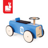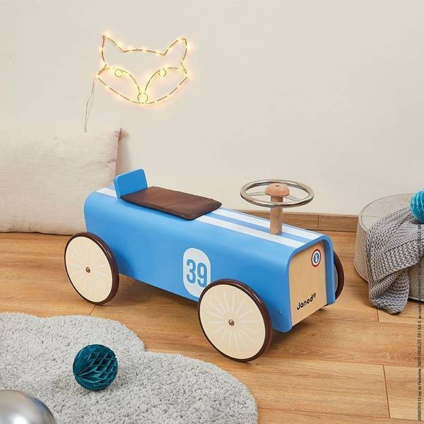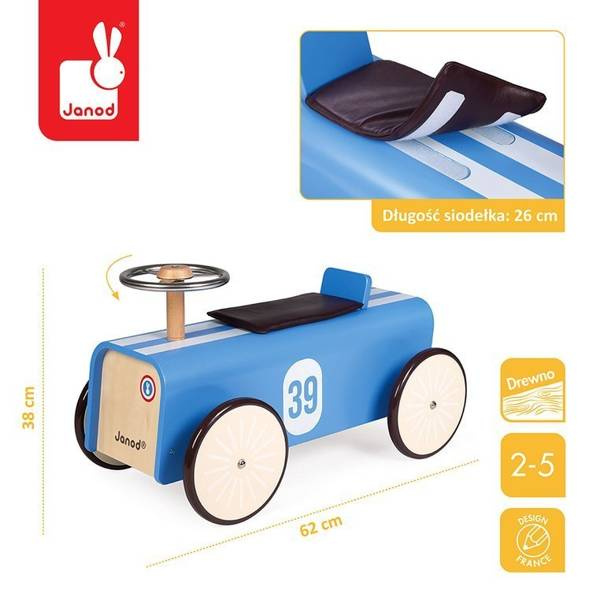 Drewniany jeździk Bolid wyścigowy francuskiej marki JANOD to idealna zabawka do domu i na podwórko. Wspiera dziecko w rozwoju ruchowym. Starannie wykonany, z najlepszej jakości materiałów i ogromną dbałością o estetykę. Ma ergonomiczną zaokrągloną budowę (gięte drewno), nadającą mu stylowy charakter auta w stylu retro, siedzisko na optymalnej wysokości (26 cm), co ułatwia dziecku samodzielne wsiadanie i zsiadanie, przyczepianą na rzepy miękką podkładkę na siedzisko oraz oparcie dla większej wygody jazdy. Lekka konstrukcja sprawia, że pojazd jest łatwy w prowadzeniu i utrzymywaniu w równowadze. Duże koła są stabilne i szeroko rozstawione, nie rysują podłogi w domu. Jeździk posiada też stylową, metalową, obracaną kierownicę. Pojazd jest niebieski z paskami i numerem, charakterystycznym dla wozów, biorących udział w wyścigach. Nauczy dziecko utrzymywania równowagi i koordynacji, będzie doskonałym wprowadzeniem do nauki jazdy na rowerku biegowym.
