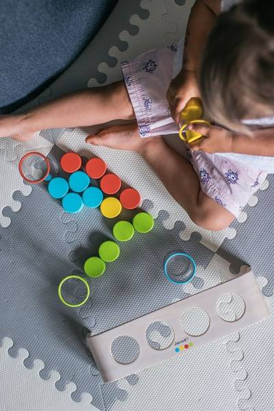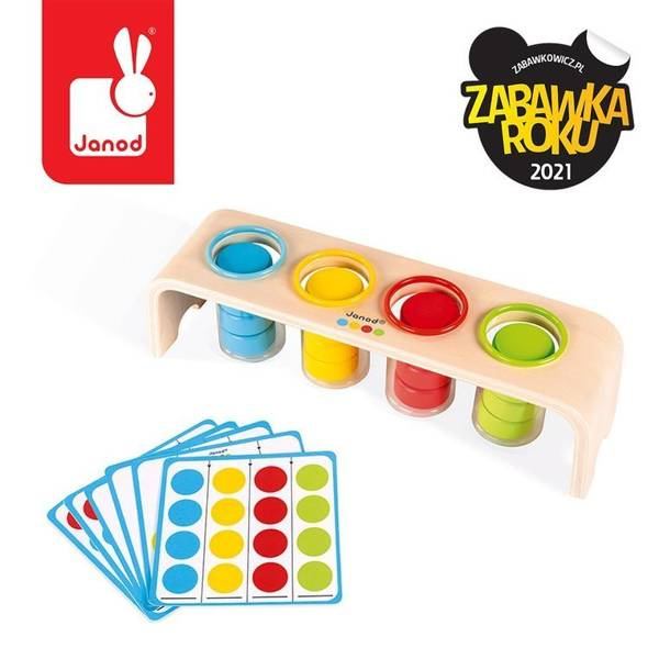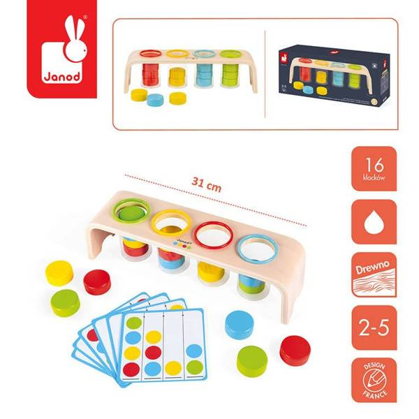 Drewniana układanka Sortowanie kolorów z serii Essentiel francuskiej marki JANOD jest idealnym wstępem do nauki rozpoznawania barw podstawowych. Pomaga również rozwijać u dziecka wiele kluczowych umiejętności, m.in. rozpoznawanie sekwencji, koncentrację, spostrzegawczość i cierpliwość. W skład zestawu wchodzi półeczka - sorter z czterema przeźroczystymi naczynkami, w których należy umieszczać drewniane krążki w odpowiednich kolorach. Klocki można układać odpowiednio do barwy obwódki wokół naczynka, zgodnie z rysunkami na załączonych kartach poleceń (jest ich 6) lub tworzyć z nich własne konfiguracje. Intensywne kolory i proste formy ułatwiają dziecku naukę. Zabawka zaprojektowana we Francji. Idealnie nadaje się na prezent.