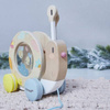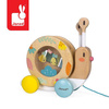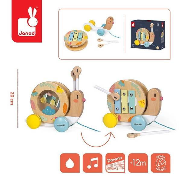 Drewniany ślimak do ciągnięcia z cymbałkami i bębenkiem z serii Pure francuskiej marki JANOD to idealna pierwsza zabawka muzyczna dla dziecka, która pomaga rozwijać słuch, poczucie rytmu i zdolności muzyczne, a przy która, tym dzięki wielu funkcjom, nieprędko się znudzi. Okrągła, zdejmowana, drewniana skorupa uroczego ślimaka po jednej stronie ma trzy blaszki, a po drugiej bębenek z przeźroczystym środkiem z tworzywa, na którym namalowane są śliczne pszczółki. Różki ślimaka to dwie drewniane, wyjmowane pałeczki, którymi można wystukiwać rytm na obu instrumentach. Ślimaczek będzie ponadto doskonałym towarzyszem pierwszych kroków dziecka. Można go prowadzić na sznurku, a rozstaw kół zapewnia zabawce stabilność. Kółka zabawki są wykończone gumą, dzięki czemu nie rysują one podłogi w domu. Zabawka wspiera rozwój motoryki i wyobraźni, koncentracji i koordynacji ruchowej. Ma piękną pastelową kolorystykę.