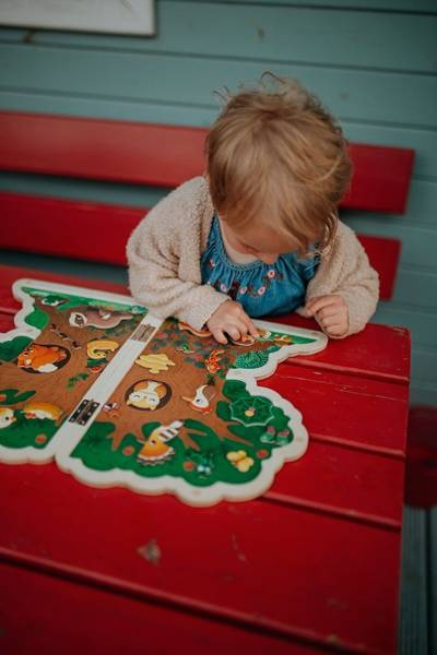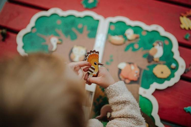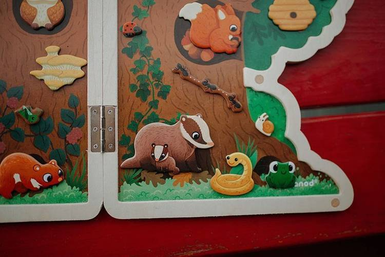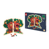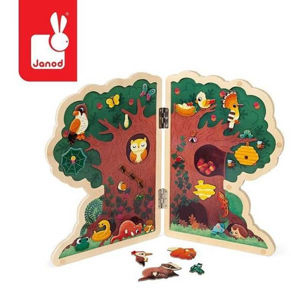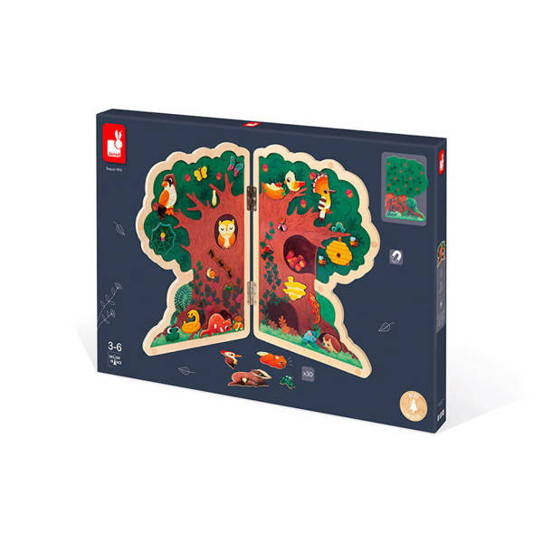 Magnetyczna układanka Drzewo francuskiej marki JANOD to doskonała zabawka rozwijająca kreatywność i wyobraźnię. Zabawa polega na układaniu magnesów na dużej, drewnianej, rozkładanej podwójnej planszy w kształcie rozłożystego drzewa. W zestawie jest 30 magnesów, przedstawiających różne zwierzęta, zamieszkujące koronę drzewa, dziuple czy okolice korzeni, m.in.: wiewiórkę, sowę, jeża, mrówki, pszczoły oraz elementy dodatkowe, jak ul, huba czy ptasie gniazdo. Układanka ta będzie służyć dziecku przez bardzo długi czas i nieprędko się znudzi, bo daje wiele możliwości kreowania drzewnego lokum i jego okolic. Jest pięknie wykonana, co dodatkowo rozbudza zmysł artystyczny, a ponadto ćwiczy logiczne myślenie oraz sprawność manualną u dziecka. To także świetny sposób na naukę przyrody. Po skończonej zabawie można ją zamknąć z magnesami w środku, co ułatwia jej przechowywanie.