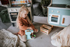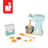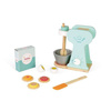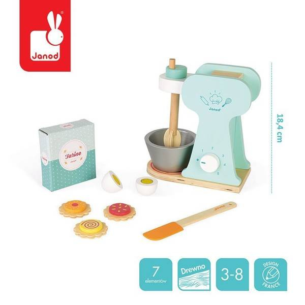 Drewniany mikser kuchenny francuskiej marki JANOD oraz 6 uroczych akcesoriów przydadzą się idealnie do zabawy w pieczenie ciastek. Zestaw składa się z miętowego miksera z drewnianym mieszadłem i srebrną miską oraz pokrętłem, które umożliwia wybór szybkości obrotów, szpatułki, opakowania mąki, dwuczęściowego jajka (na rzep) oraz 3 gotowych ciasteczek. Utrzymany jest w uroczych kolorach – jasnego drewna, bieli, mięty oraz brzoskwiniowym.