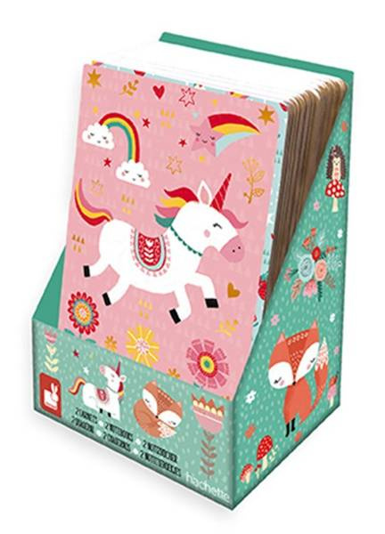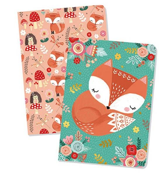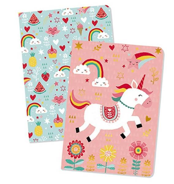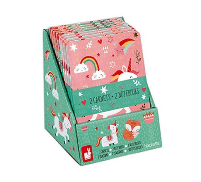 Zestaw 2 miękkich notesów z serii akcesoriów papierniczych francuskiej marki JANOD składa się z zeszytów w grubszych, baśniowych okładkach z motywem jednorożca lub lisa (do wyboru). Jeden z notatników ma czyste kartki, a drugi – kartki w linie, oba mają wewnętrzny kwiatowy margines wokół każdej strony i utrzymane są delikatnej dziewczęcej kolorystyce: odcieniach różu i niebieskiego (zestaw z jednorożcem) oraz pomarańczu i turkusu (zestaw z lisem). Notesy mają poręczny format i idealnie nadają się do zapisywania pomysłów, robienia notatek czy szkicowania.